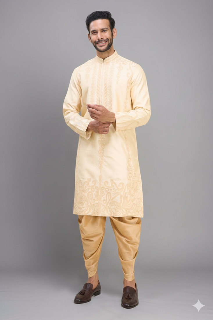 Yellow embroidered men’s silk kurta patiala set