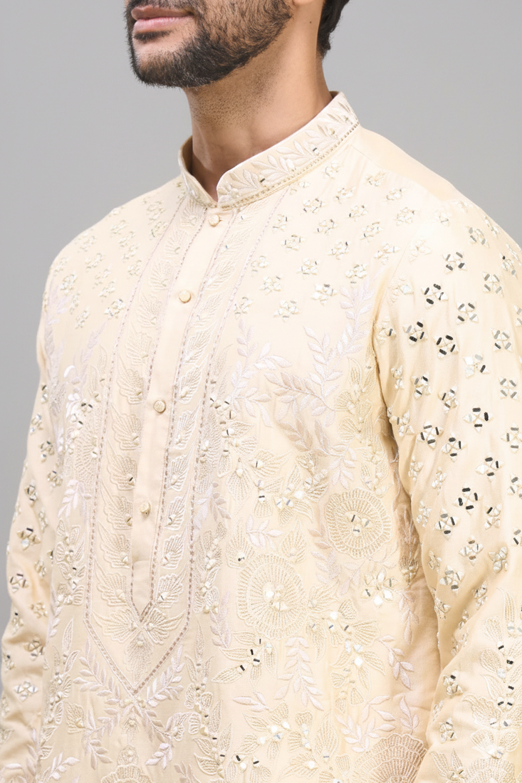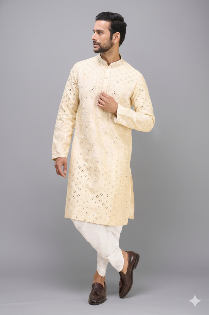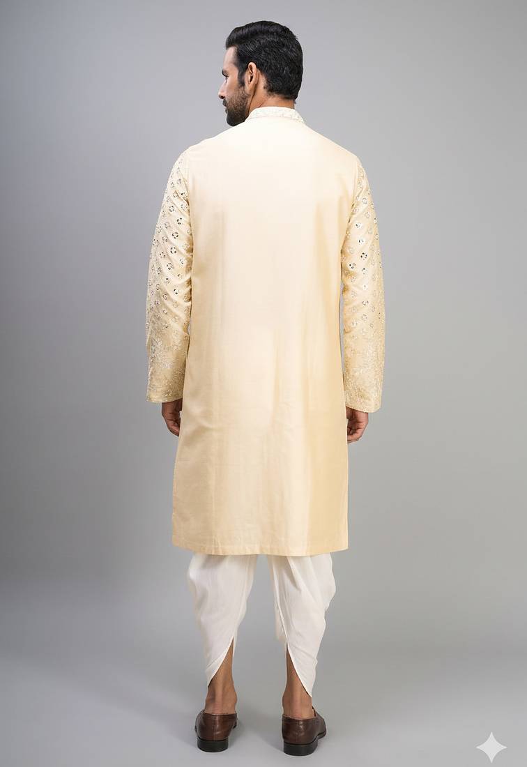 | Product Description | Add A Soft Festive Touch To Your Wardrobe With This Cream Embroidered Men’s Kurta Patiala Set, Designed With Subtle Detailing And A Clean Traditional Look. Crafted From Silk Fabric, The Kurta Offers A Smooth Texture With A Gentle Sheen That Enhances The Overall Appeal. The Cream Top Features Detailed Embroidery Across The Front And All Over The Surface, Adding Depth While Keeping The Design Balanced And Easy To Wear. The Off White Patiala Bottom, Made From Silk, Provides A Comfortable Fit With Its Relaxed And Pleated Style. The Light Combination Of Cream And Off White Creates A Clean And Well Coordinated Appearance That Looks Refined. Ideal For Weddings, Festive Occasions, And Cultural Celebrations, This Kurta Patiala Set Pairs Well With Traditional Footwear For A Complete And Confident Ethnic Look. |