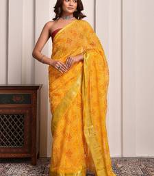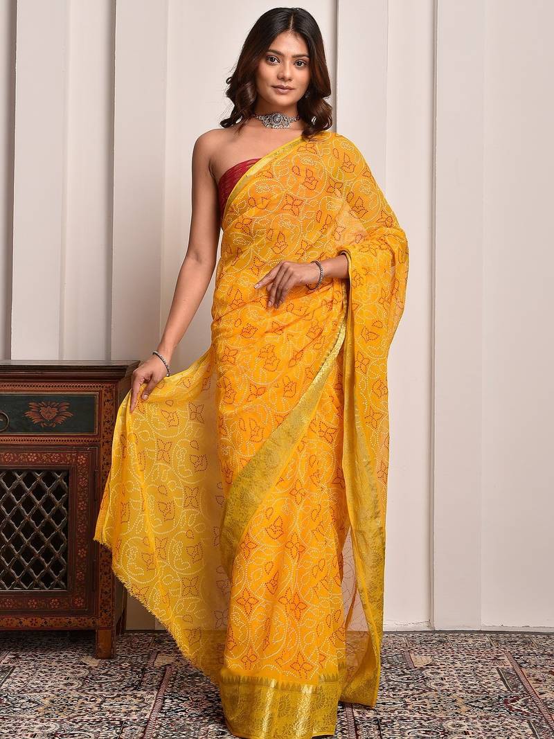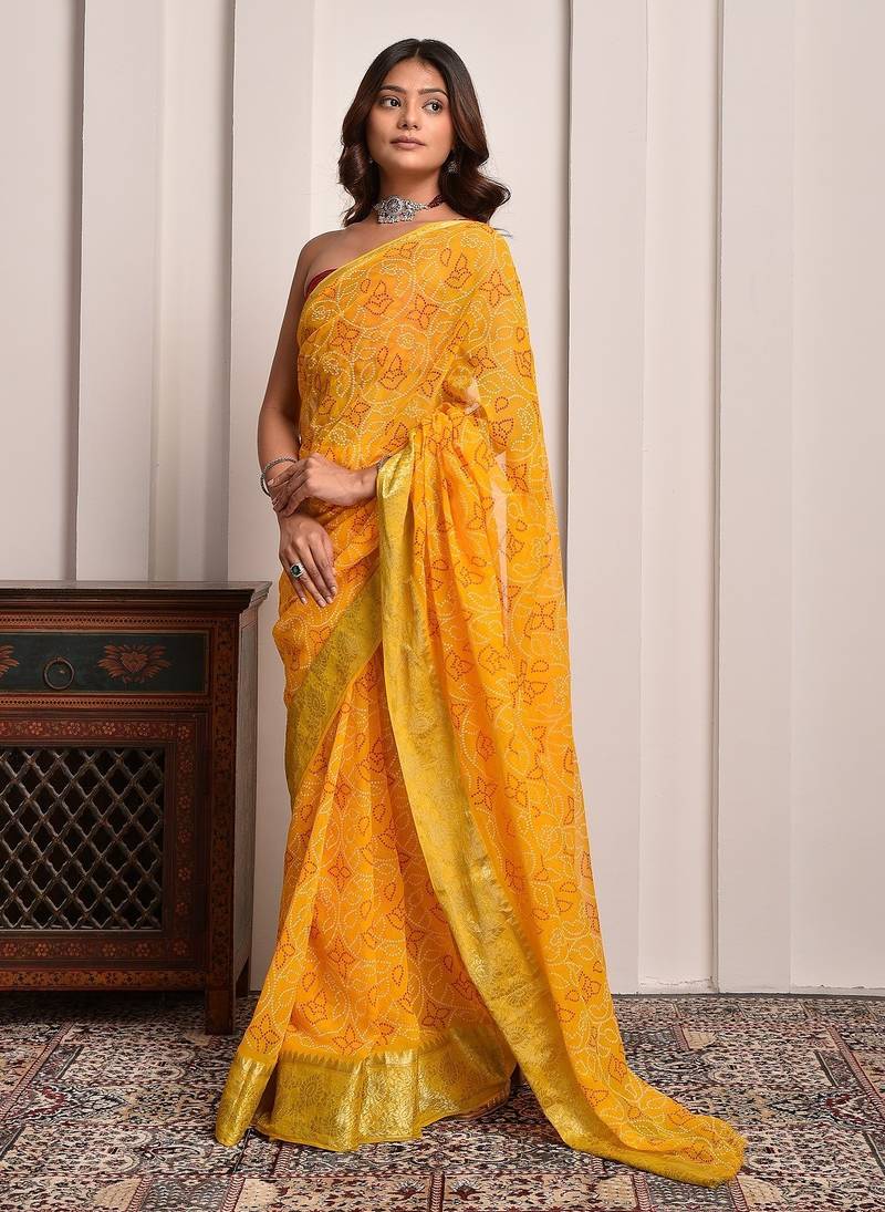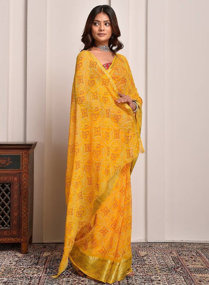 | Product Description | Features: Gracefully Crafted In Lightweight Georgette, This Yellow Bandhani Saree Is Finished With A Refined Zari Border For A Festive Touch. Color: Yellow