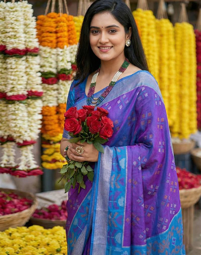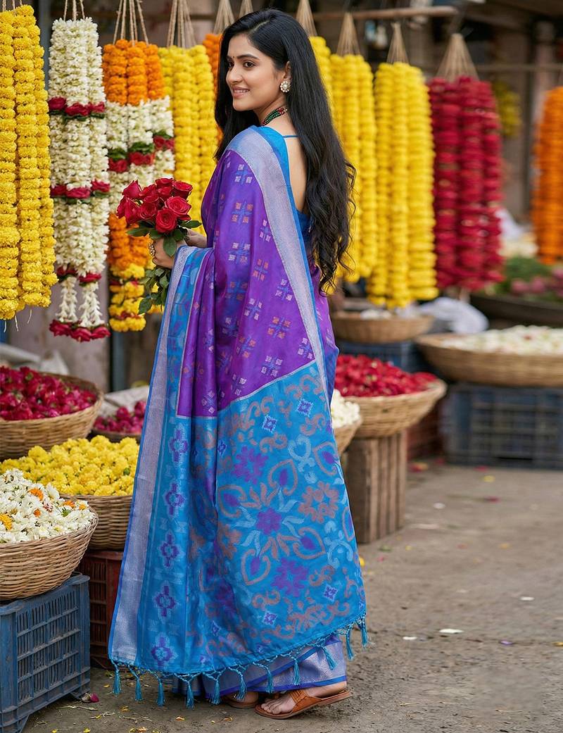 | Product Name | Sutriti Exquisite Violet & Sky Blue Pochampalli Soft Silk Saree With Grand Ikat Woven Pallu | |