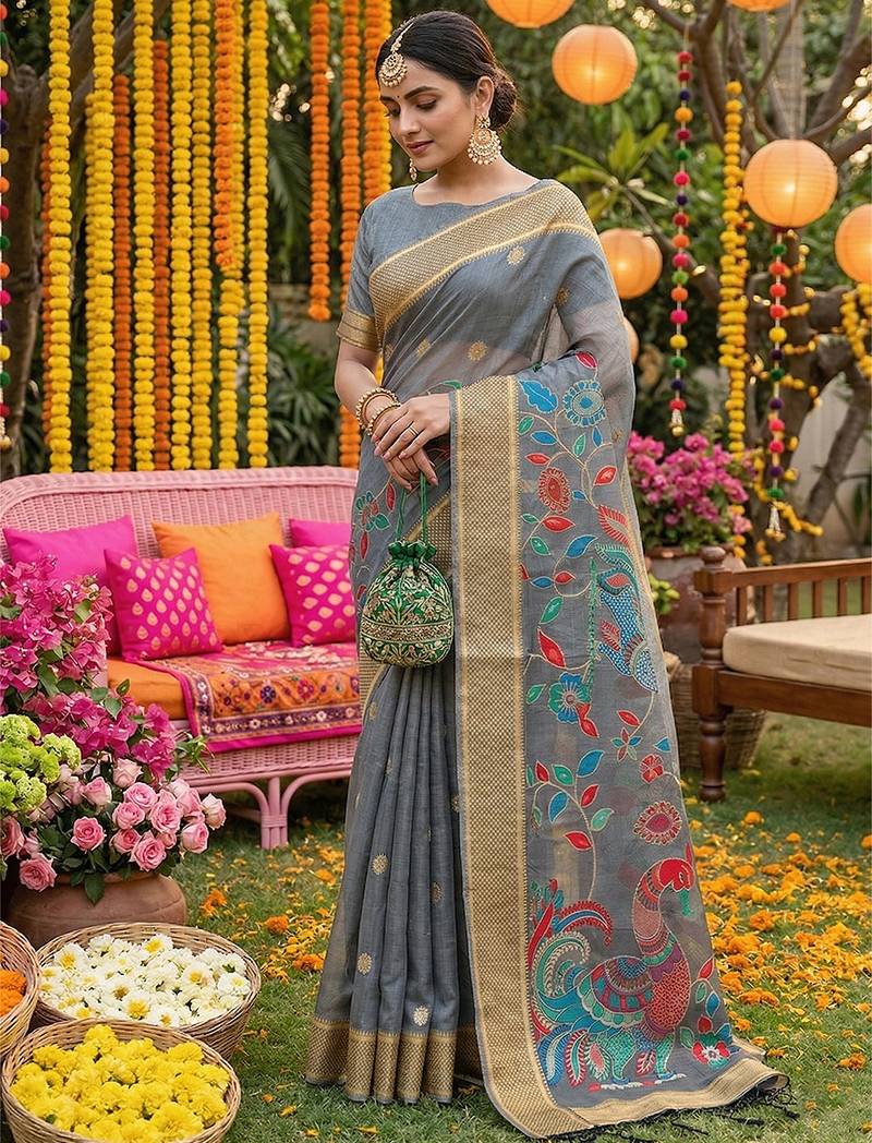 Sutriti grey linen saree for women festive wedding party wear ethnic designer saree