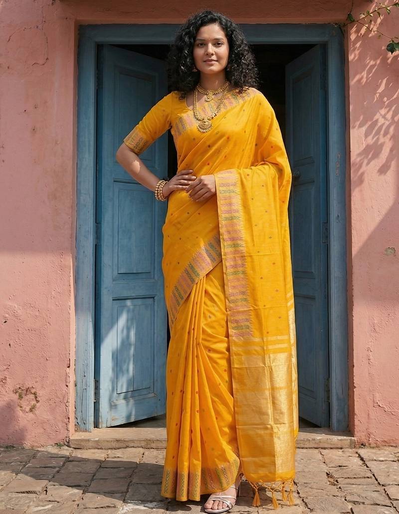 Sutriti haldi mustard yellow soft silk saree with traditional zari border | festive indian ethnic wear for weddings