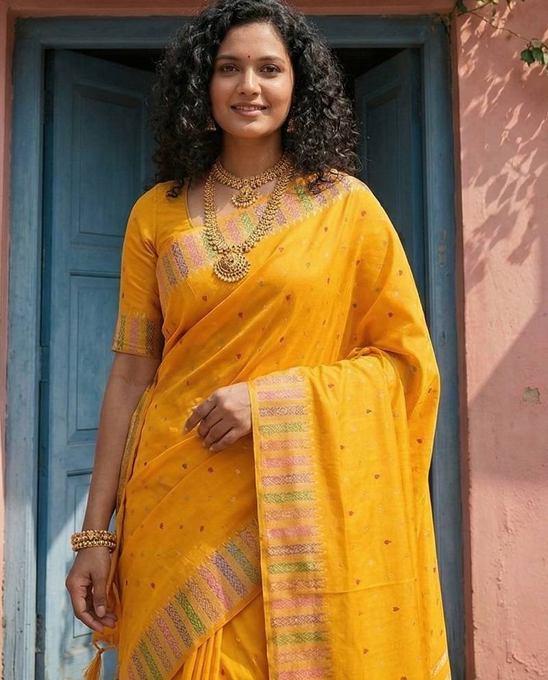 | • | Saree | : | Color- Yellow / Fabric- Silk |