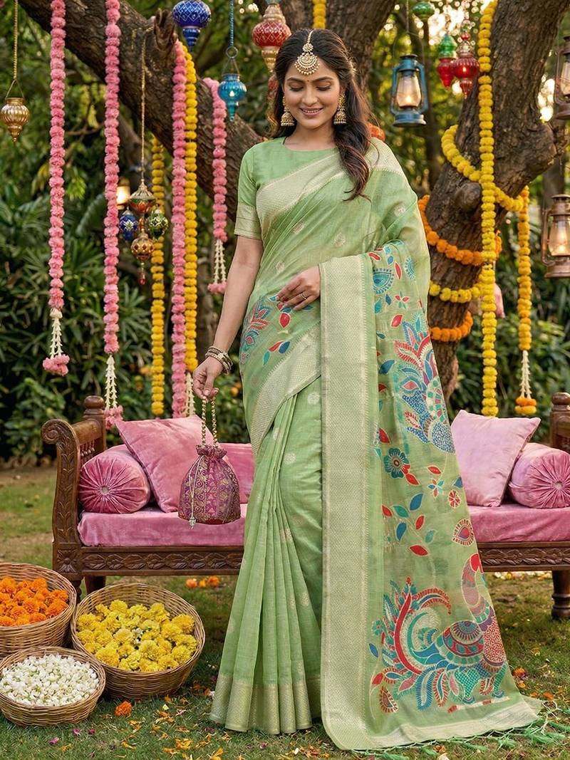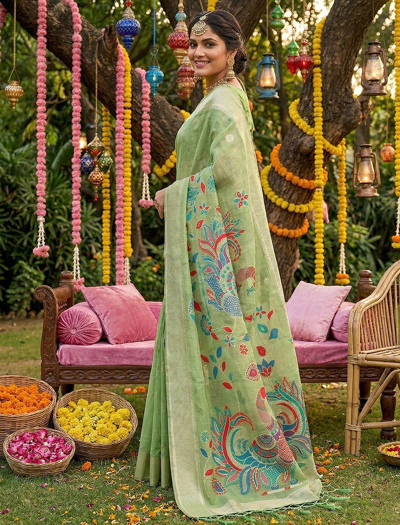 Sutriti mehendi green linen saree for women festive wedding party wear ethnic saree