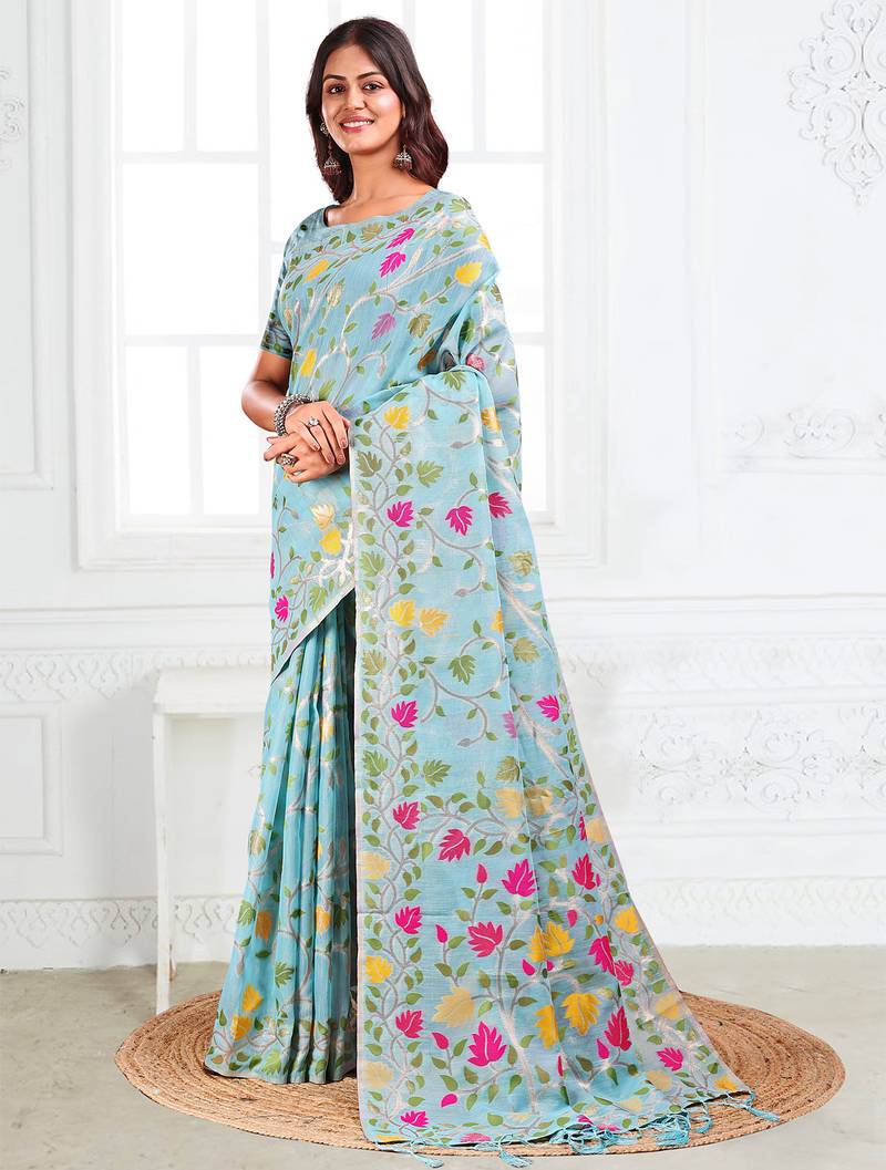 | • | Saree | : | Color- Sky Blue / Fabric- Linen |