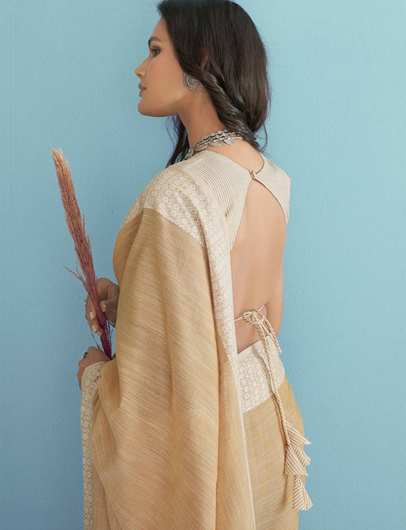 Sutriti mustard beige linen saree for women elegant festive ethnic party wear saree