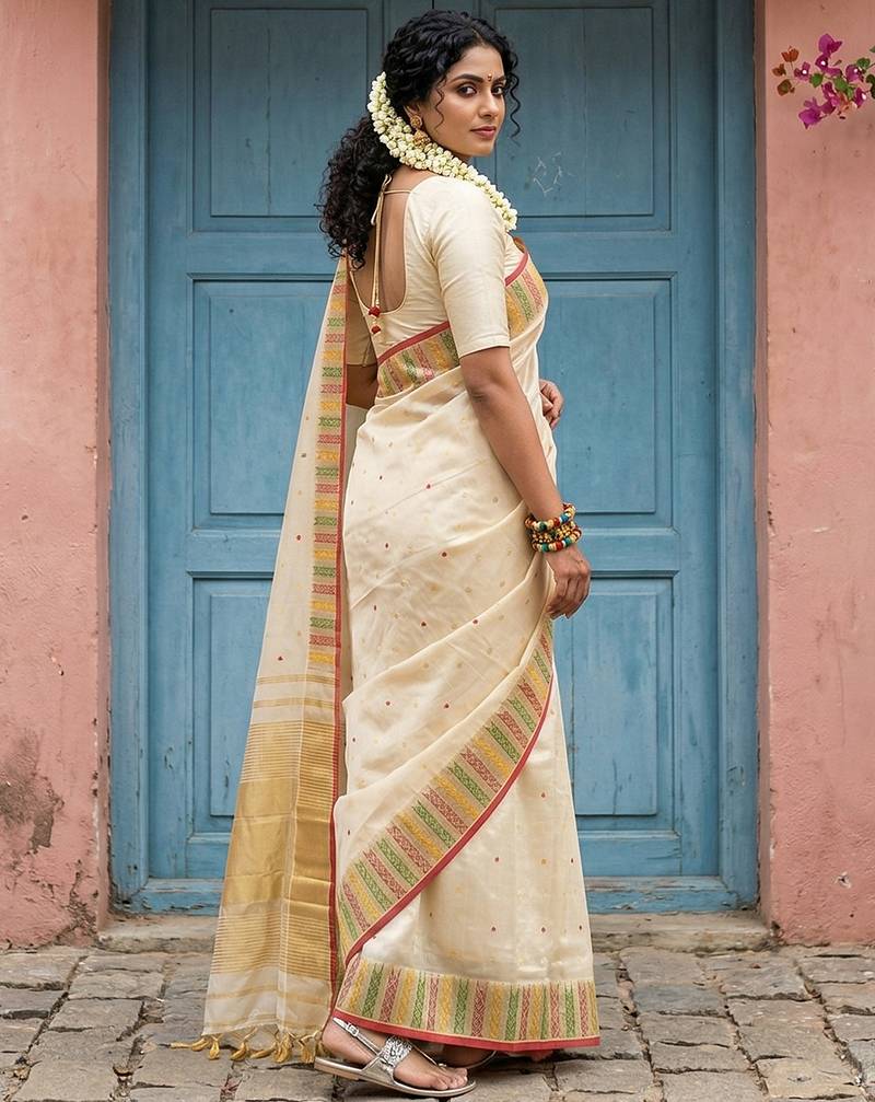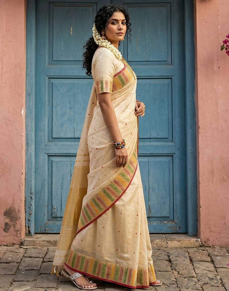 Sutriti off-white cream soft silk saree with gold zari border | kasavu inspired festive wear for onam & pooja
