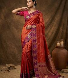 Sutriti red orange banarasi soft silk saree for women festive wedding ethnic wear