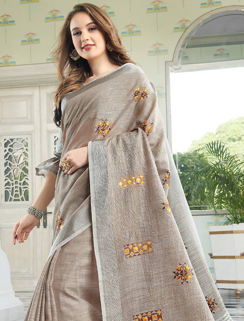 | Product Name | Sutriti Women Brown Linen Saree With Floral Embroidery Border & Tassels | |