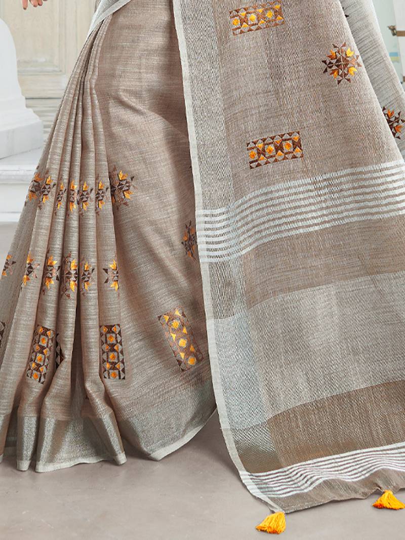 Sutriti women brown linen saree with floral embroidery border & tassels