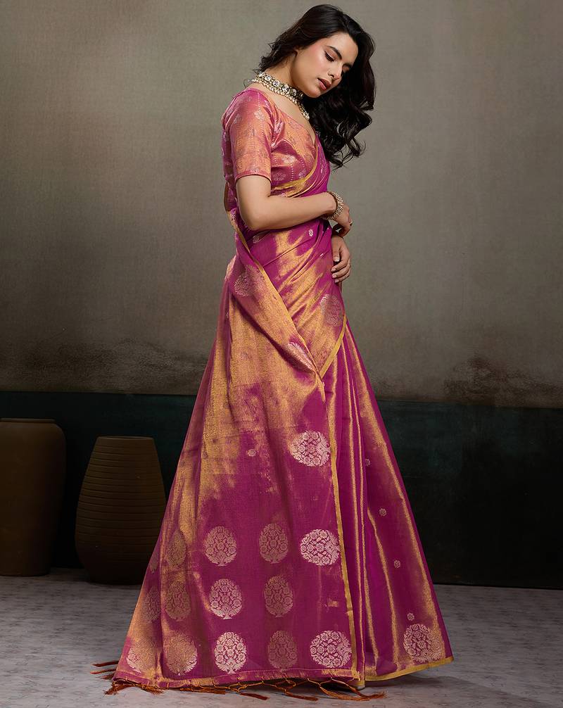 Sutriti women magenta purple woven tissue silk saree with mandala motifs