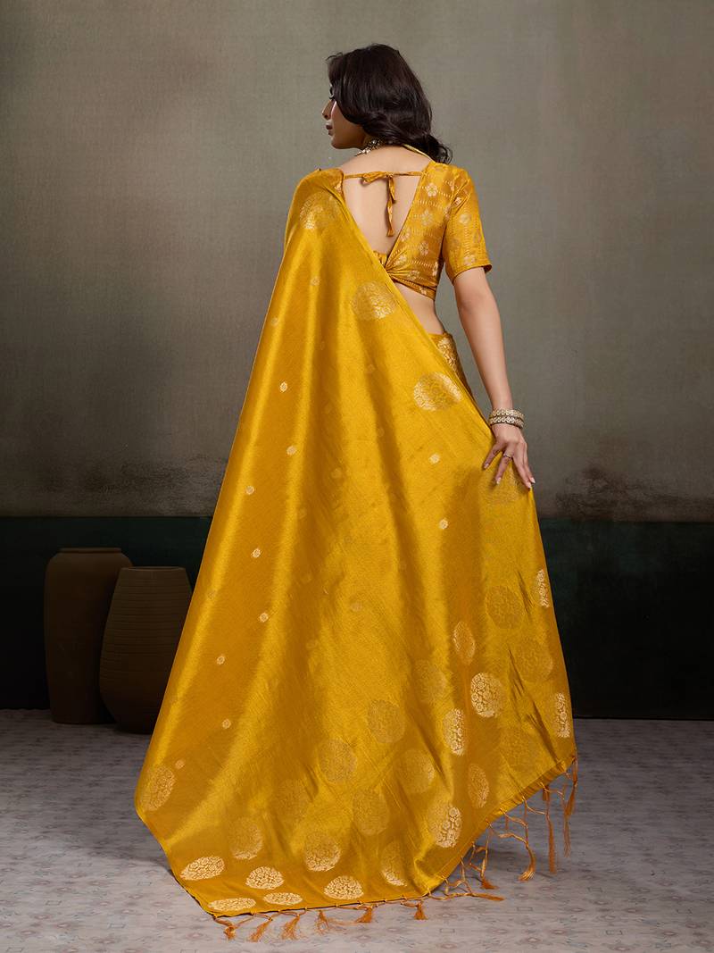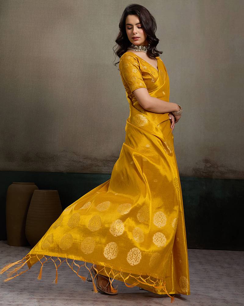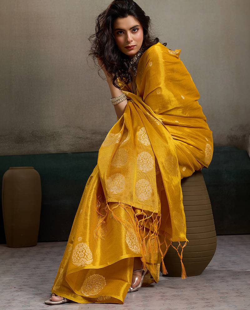 Sutriti women mustard yellow woven tissue silk saree with mandala motifs