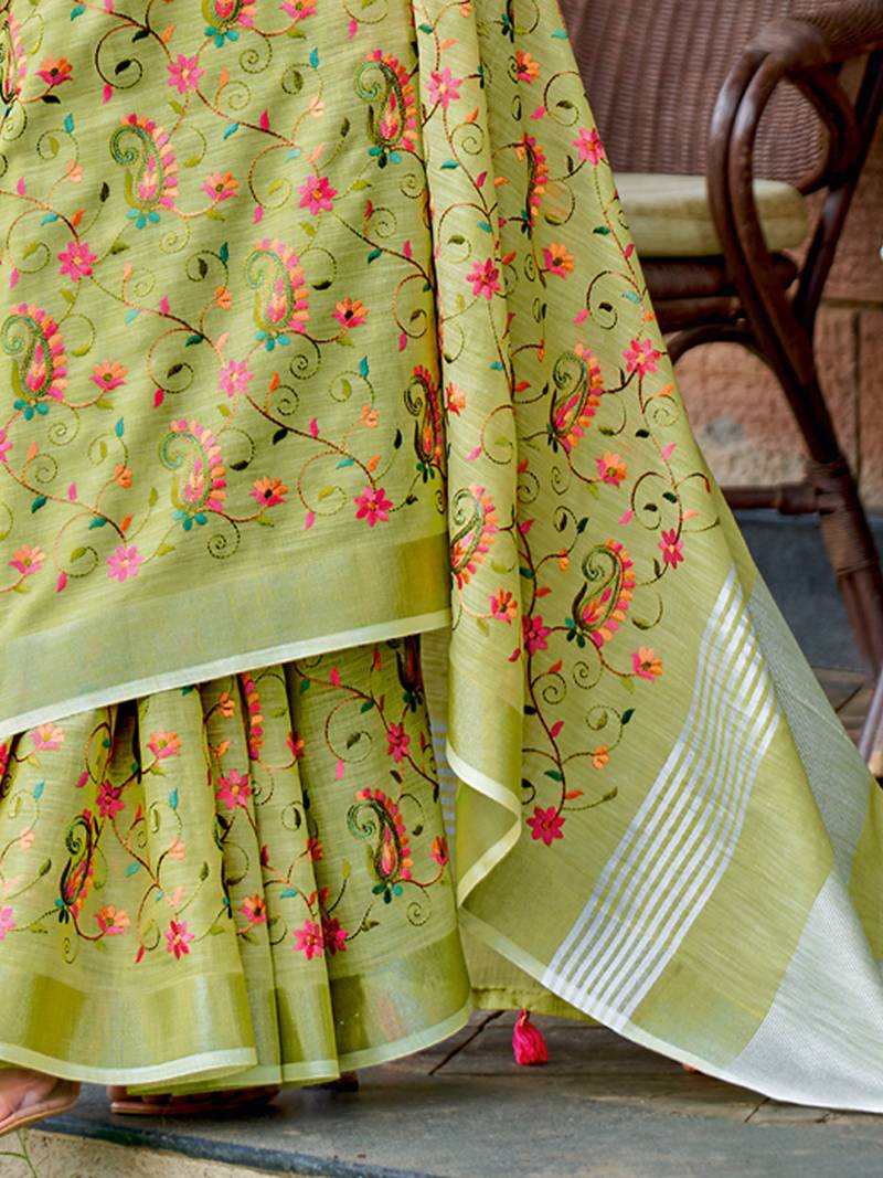 Sutriti women premium linen saree with placement embroidery and tassel pallu