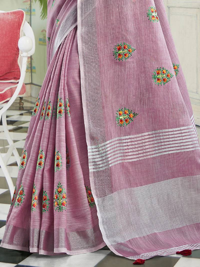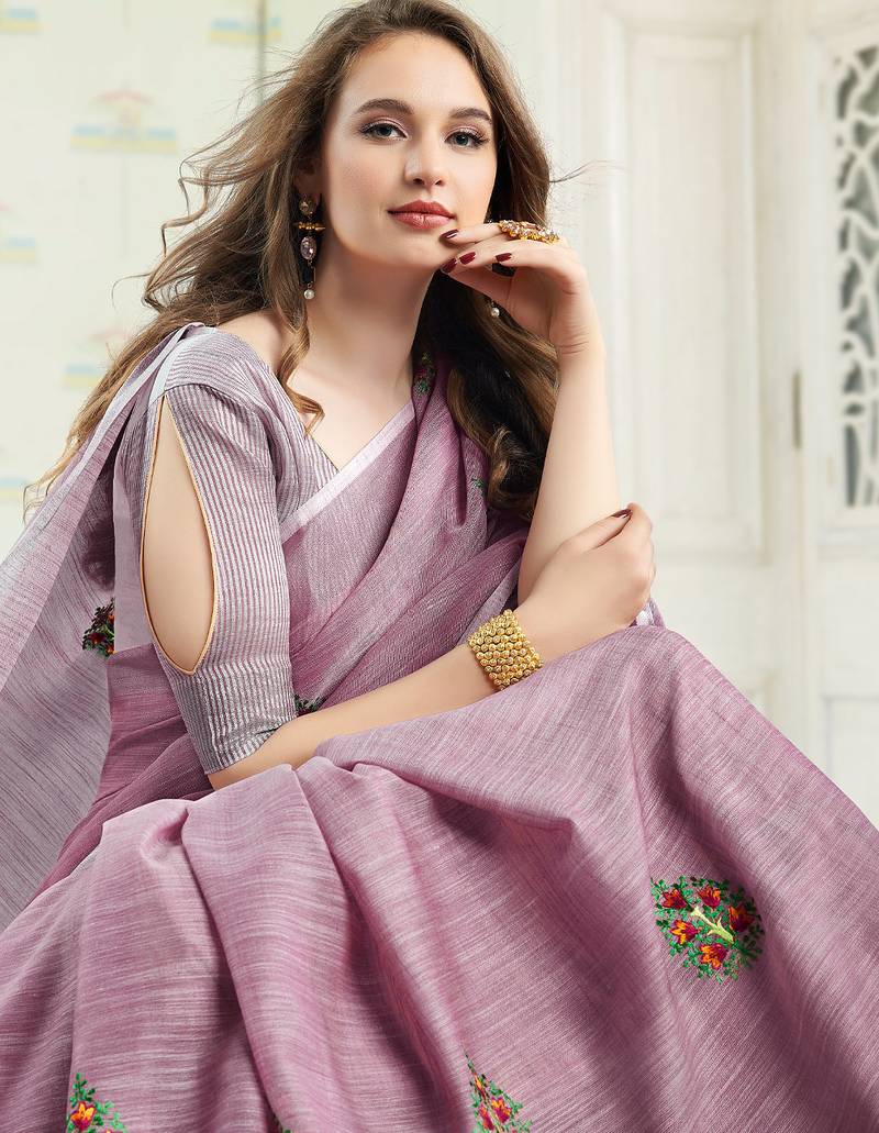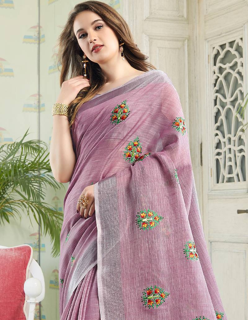 Sutriti women purple linen saree with floral embroidery border & tassels