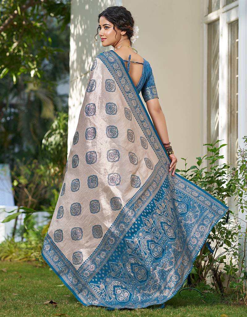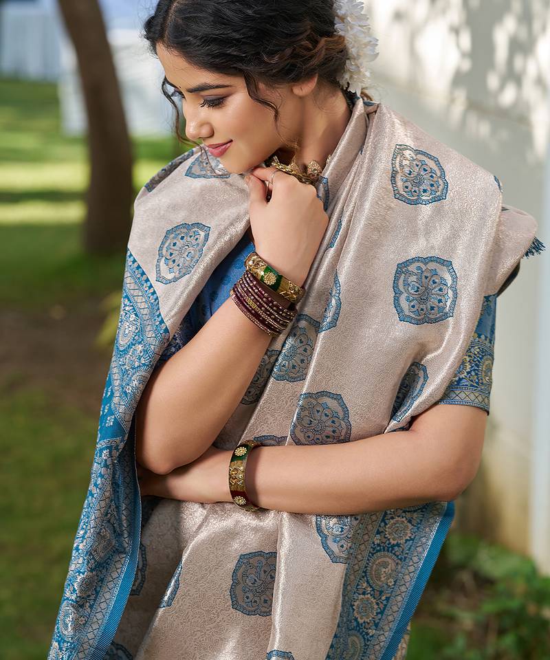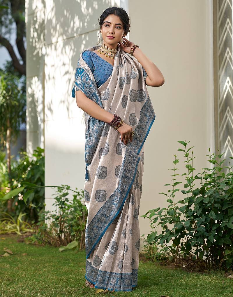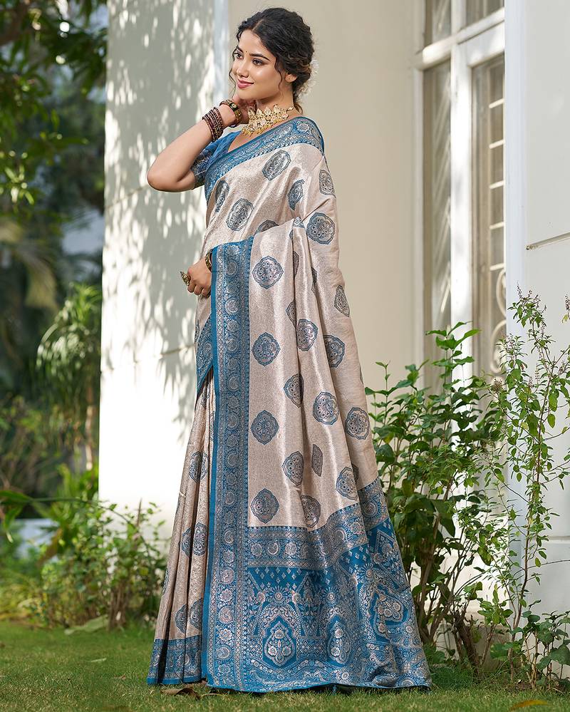 Sutriti women's beige banarasi silk saree with blue border | festive wedding party ethnic wear