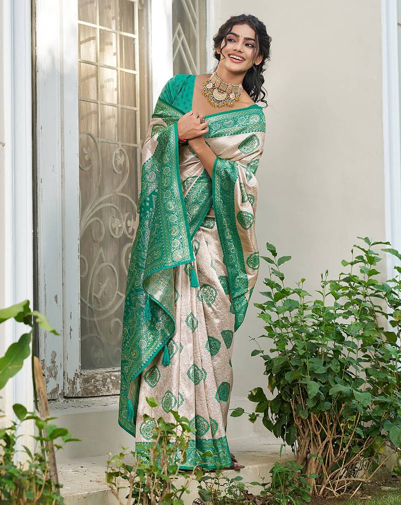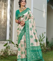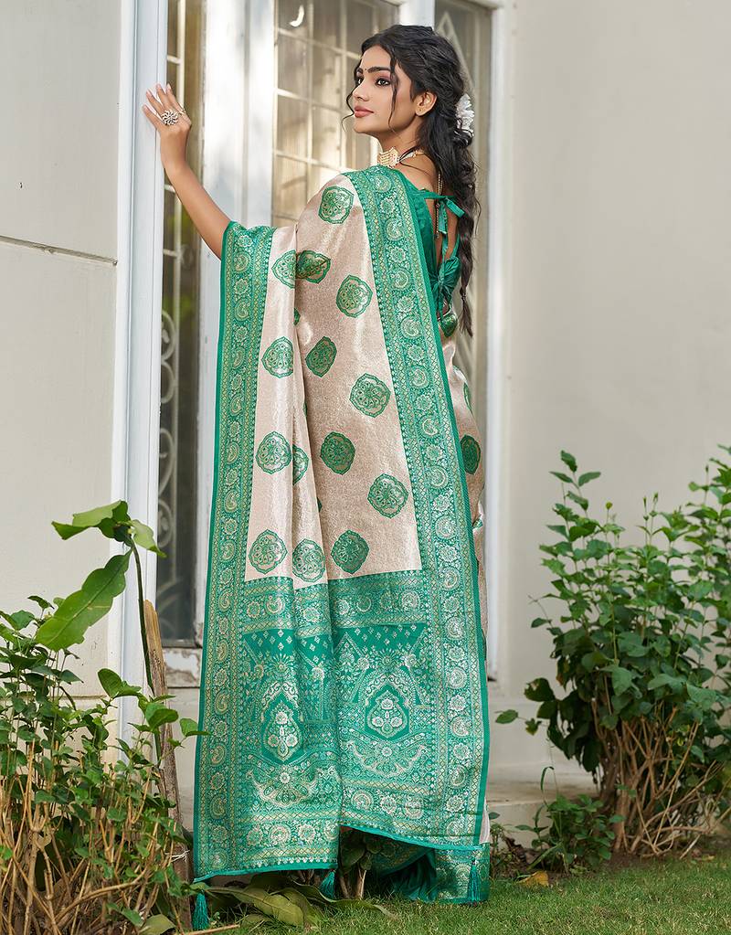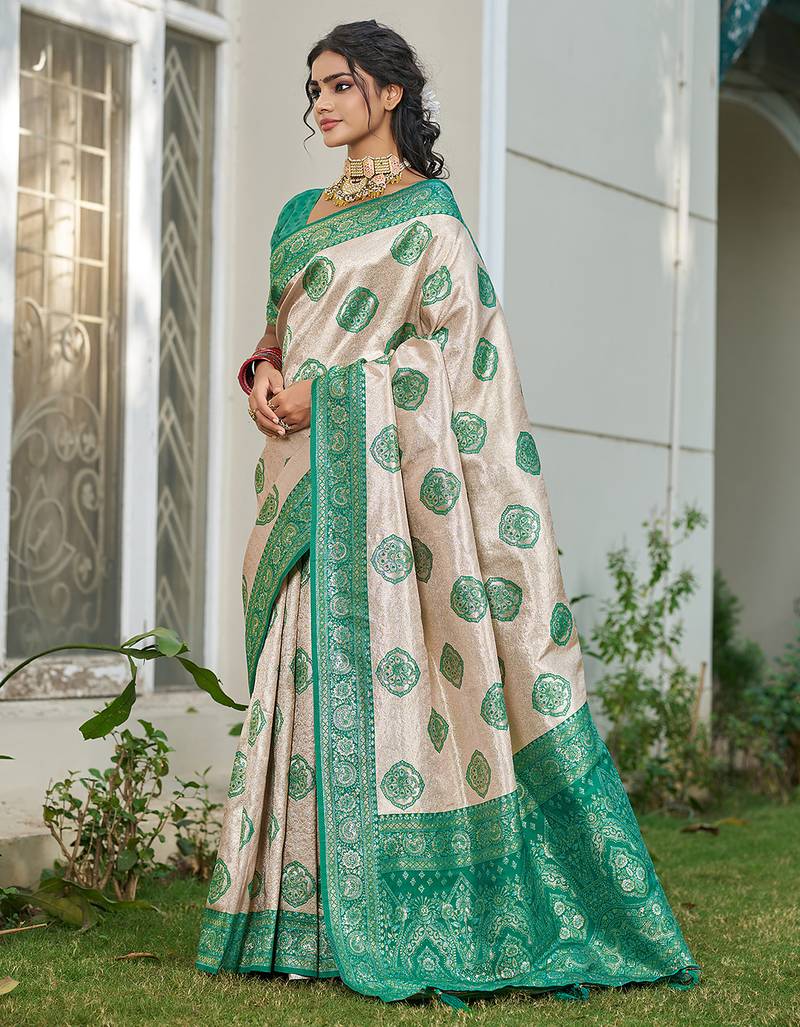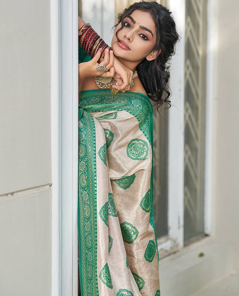 Sutriti women's beige banarasi silk saree with green border | festive wedding party ethnic wear