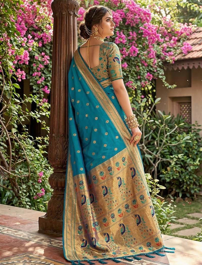 | • | Saree | : | Color- Sky Blue / Fabric- Paithani Silk |