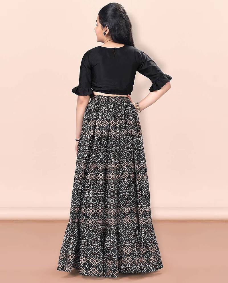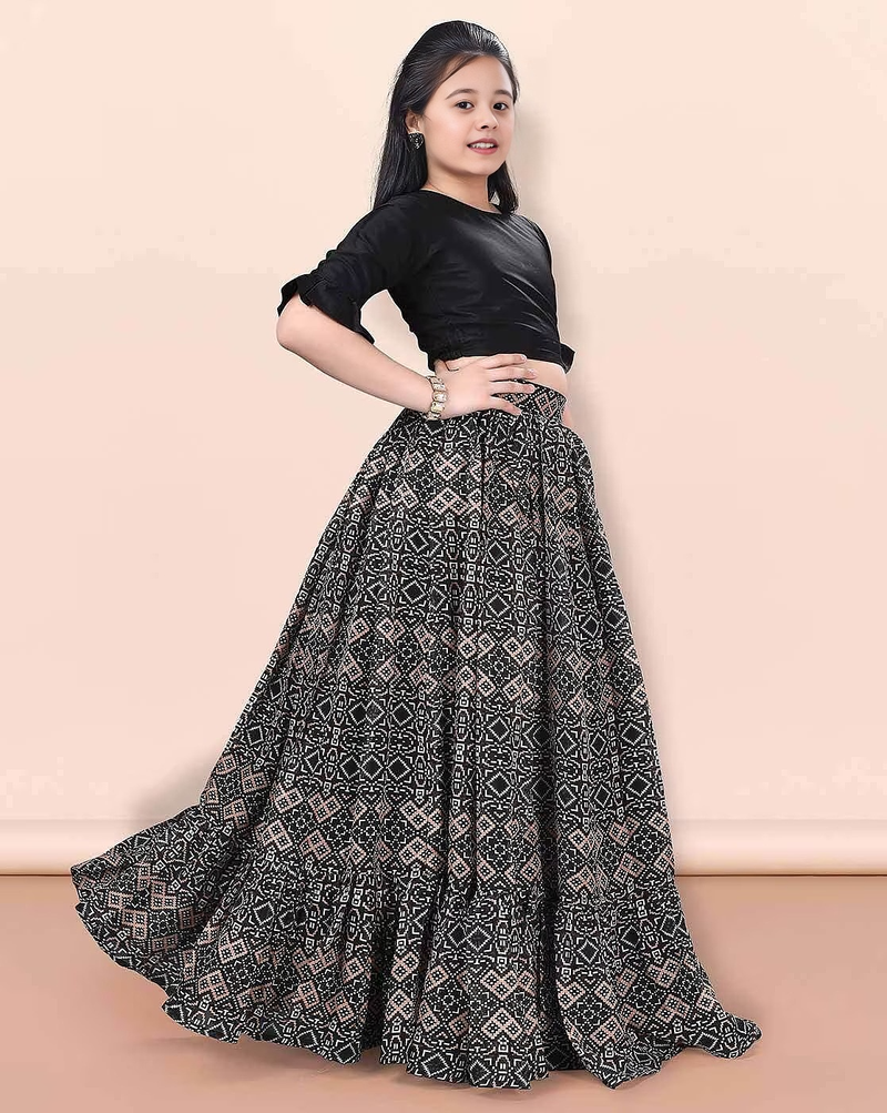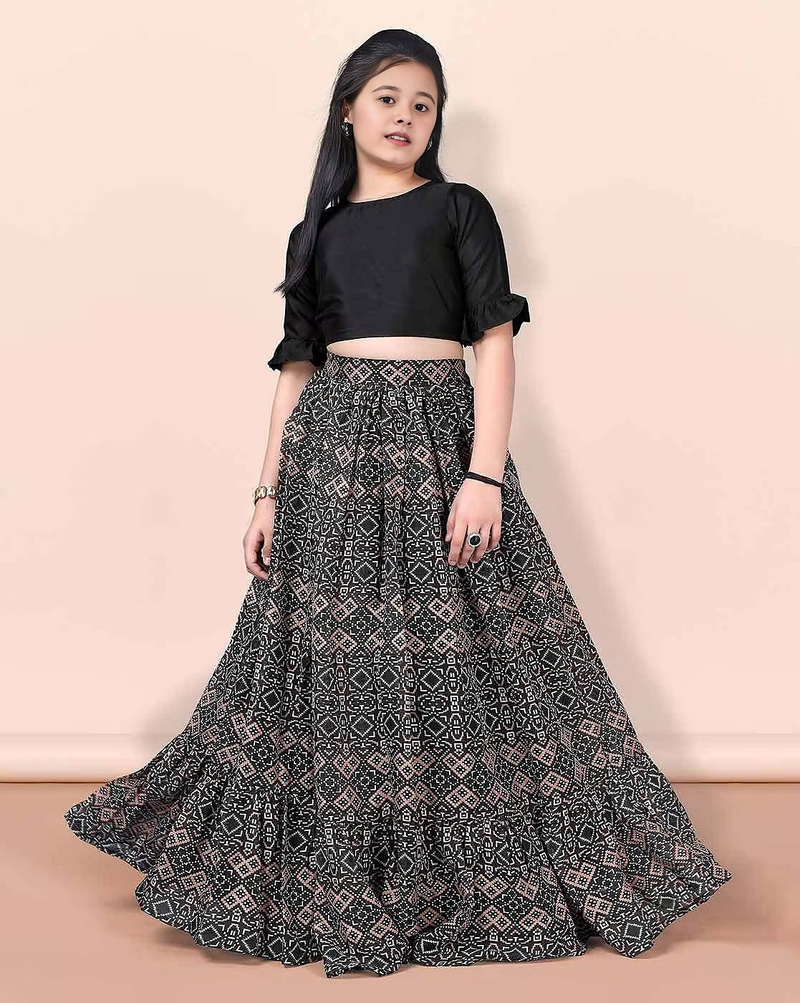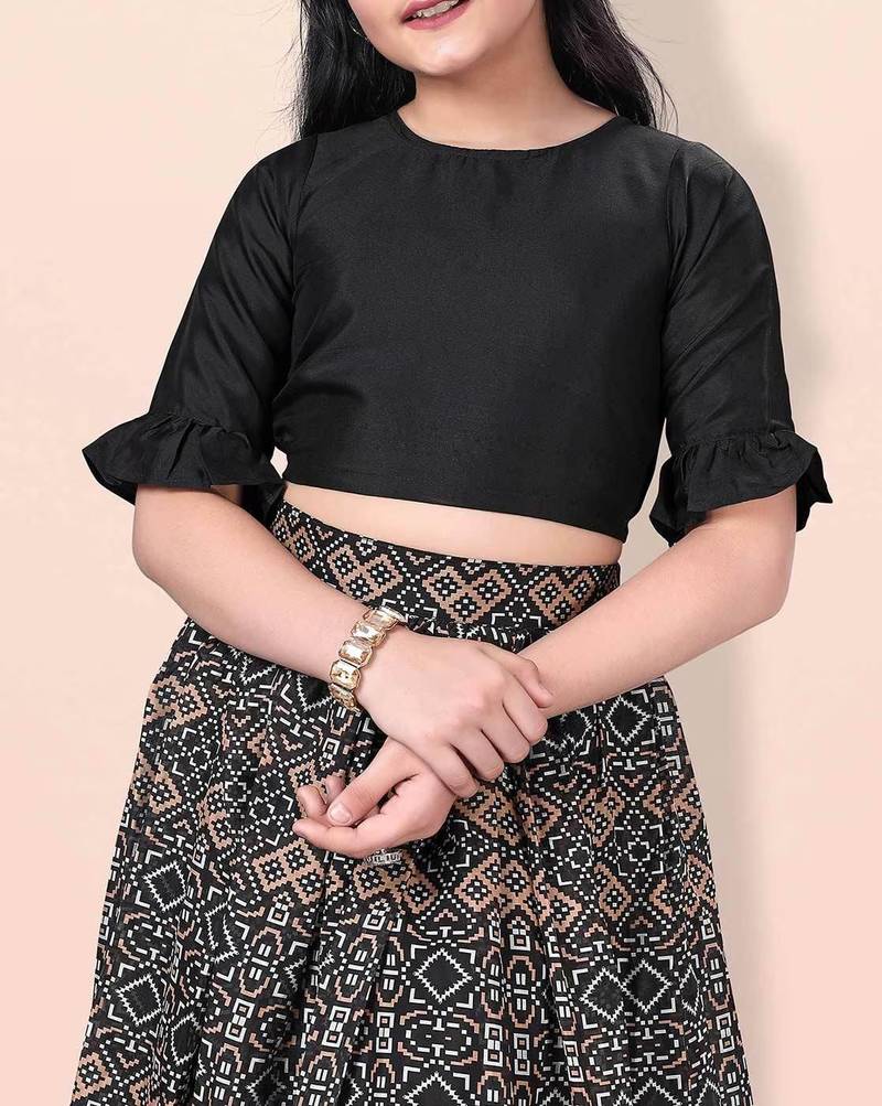 | Product Description | Premium Black Crop Top Paired With A Beautifully Flared Printed Lehenga For An Elegant Ethnic Look Soft And Breathable Fabric Ensures All Day Comfort For Kids During Festive Occasions Stylish Half Sleeves With Subtle Frill Detailing Add A Modern Touch To The Outfit Intricate Geometric Print On The Skirt Enhances The Overall Traditional Yet Trendy Appeal Perfect Choice For Weddings, Parties, Festivals, And Special Occasions |