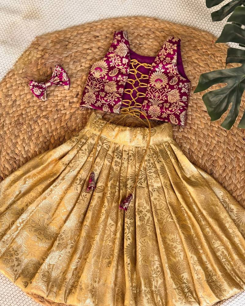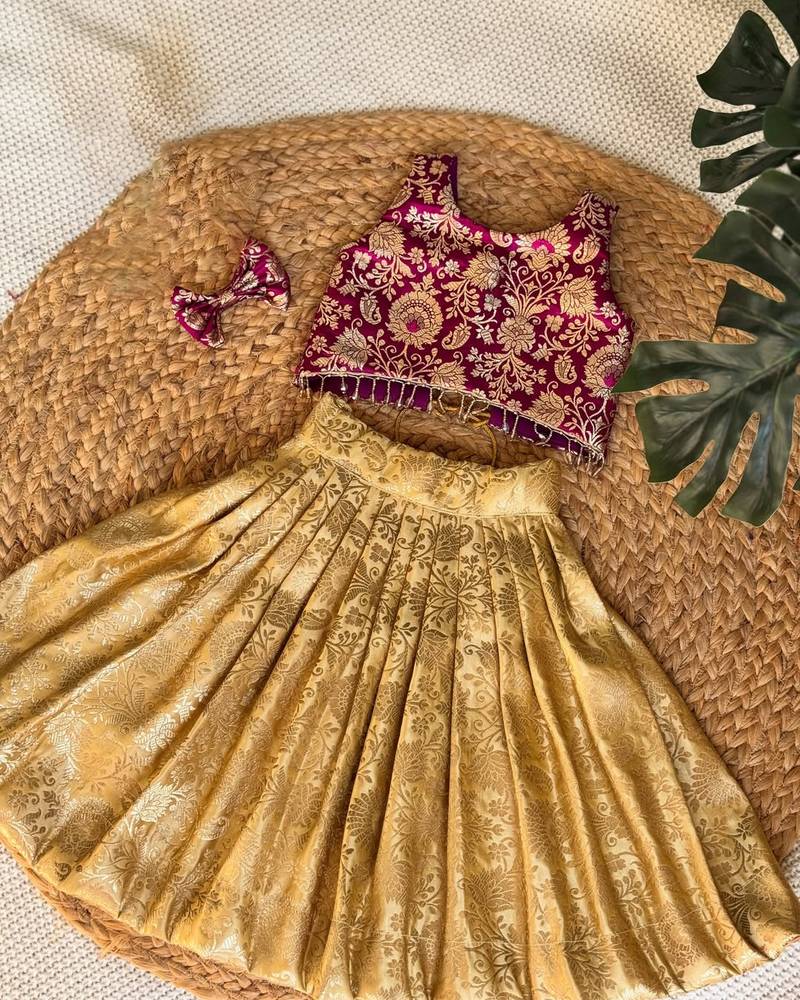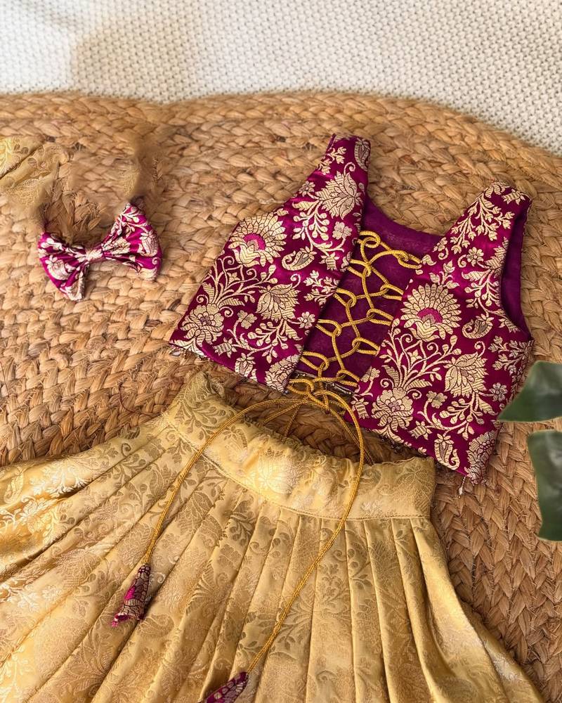 | Product Description | Give Your Little One A Royal Festive Look With This Beautifully Crafted Lehenga Choli Set. Designed With Rich Brocade Fabric, The Outfit Features A Stunning Maroon Blouse Adorned With Intricate Golden Floral Weaving, Perfectly Paired With A Flared Golden Lehenga. The Elegant Detailing And Traditional Charm Make It An Ideal Choice For Weddings, Festivals, And Special Occasions. The Soft Inner Lining Ensures All Day Comfort, While The Included Matching Bow Adds An Extra Touch Of Cuteness And Style. |