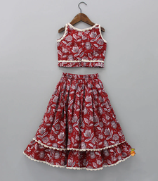 Red & white floral print with lace border detailing sleeveless crop top flared lehenga girls ethnic kids lehenga choli