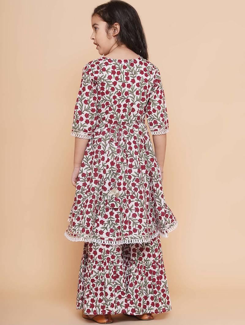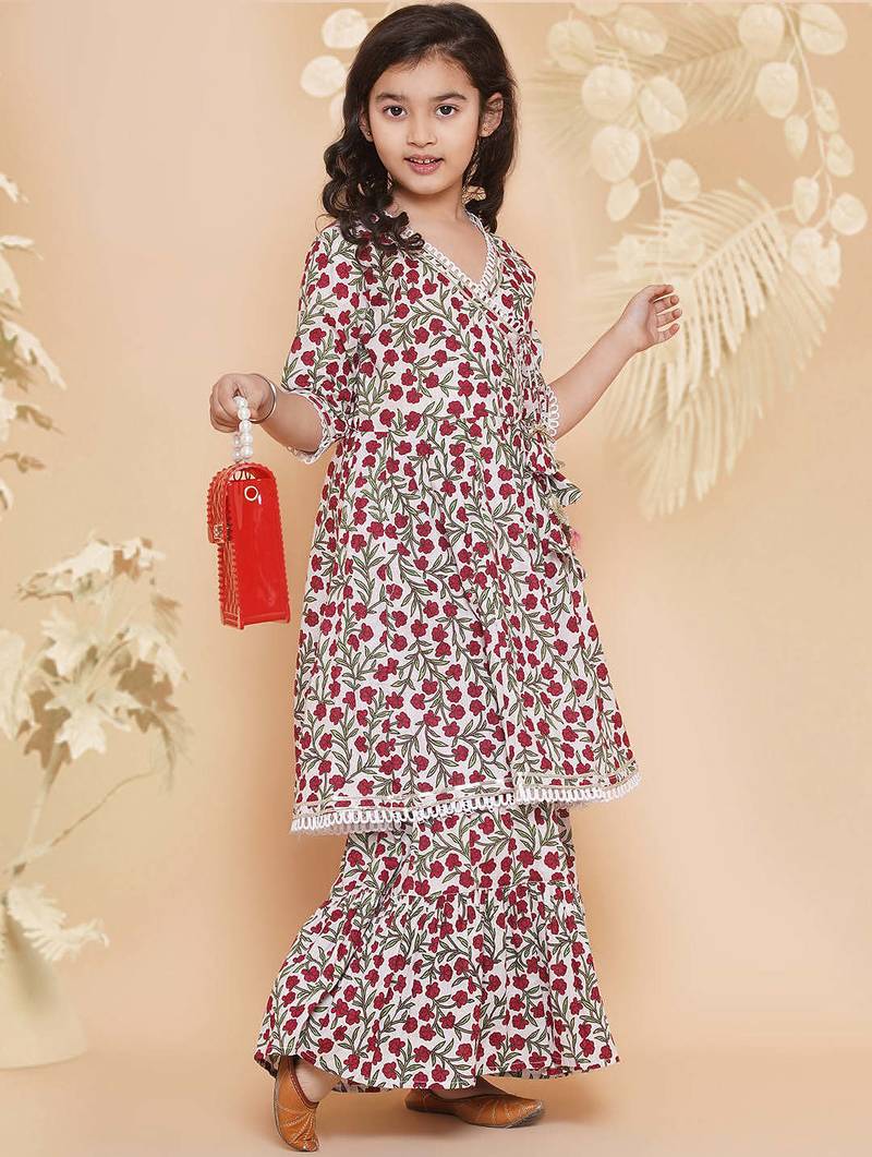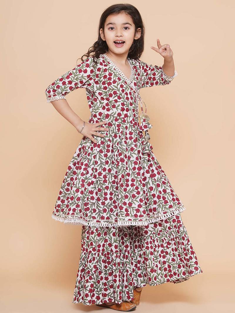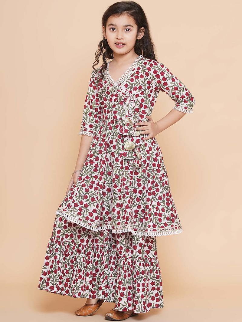 | Product Description | Beautiful Off White Ethnic Set Featuring Vibrant Red Floral Prints With Green Detailing, Giving A Fresh And Lively Look. Designed With An Angrakha Style Kurti, Enhanced By A Stylish Side Tie Up With Tassels For A Traditional Touch. Crafted From Soft, Breathable Cotton Fabric, Ensuring All Day Comfort For Kids. Elegant Lace Accents On The Neckline, Sleeves, And Hem Add A Delicate And Charming Finish. Paired With A Flared, Layered Sharara Style Bottom, Making It Perfect For Festive Occasions, Family Functions, And Celebrations. |
