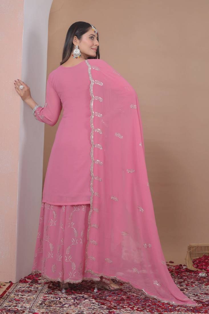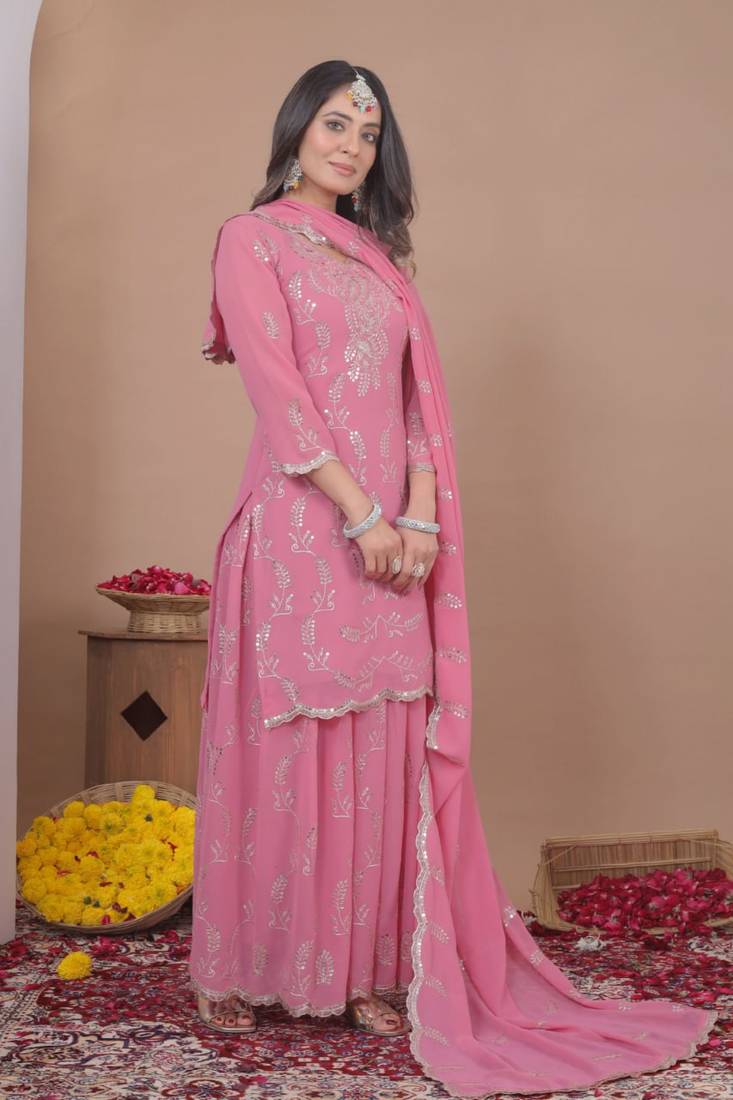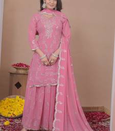 Baby pink color faux georgette wedding wear trending plazo set stitched