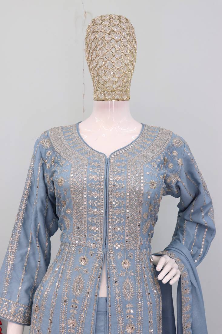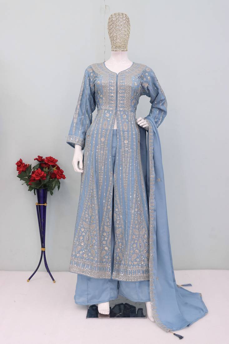 | Product Name | Blue Color Chinnon Silk Heavy Embroidery Work Party Wear Long Gown | |