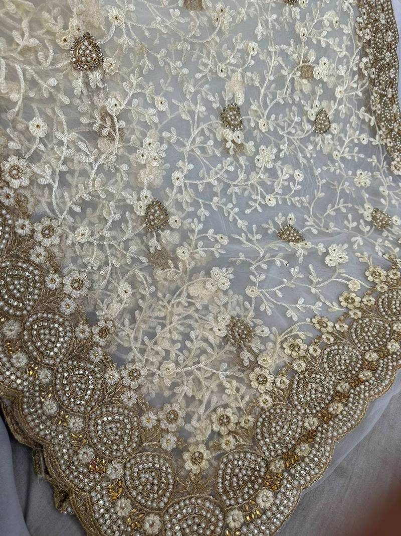 Blue color net fabric wedding wear heavy embroidery work with pearls diamonds work saree