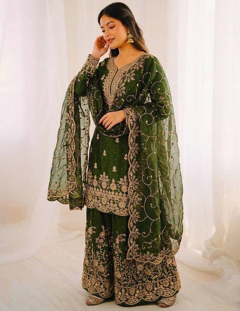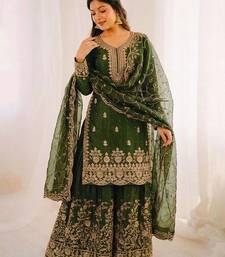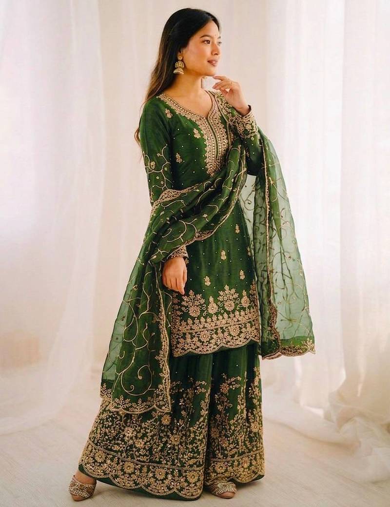 Green color gymmi silk embroidery work wedding wear sharara set stitched
