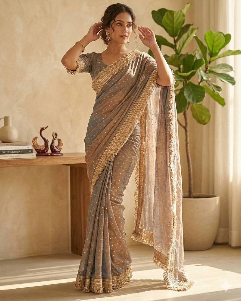 | • | Saree | : | Color- Grey / Fabric- Silk |