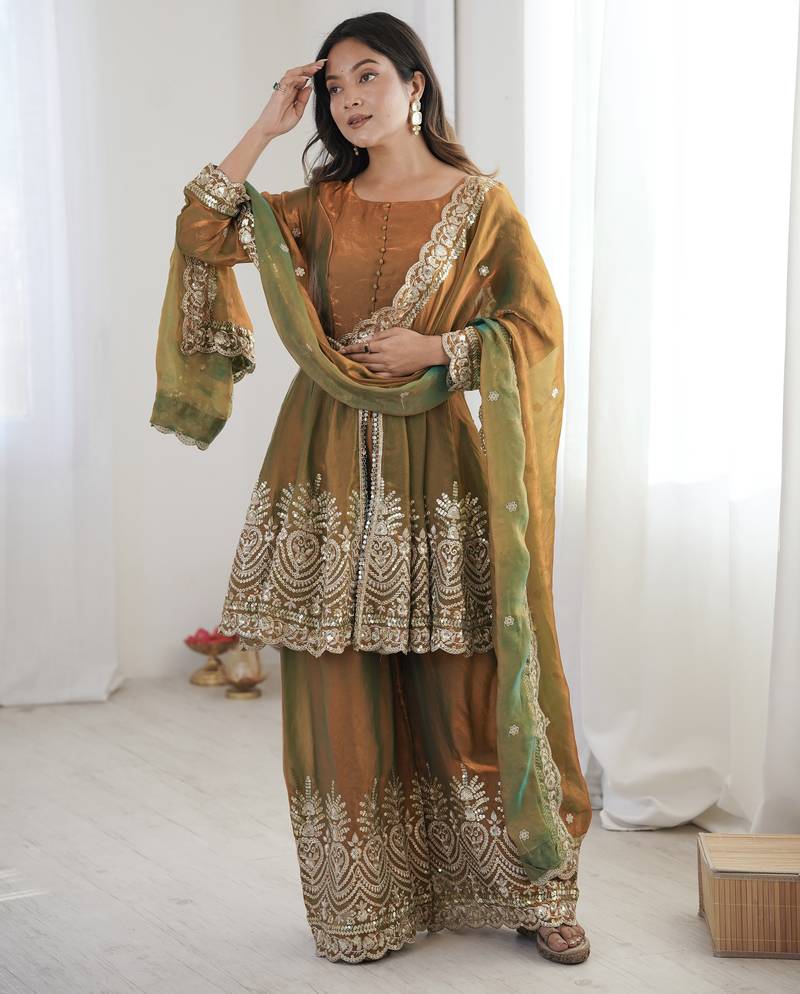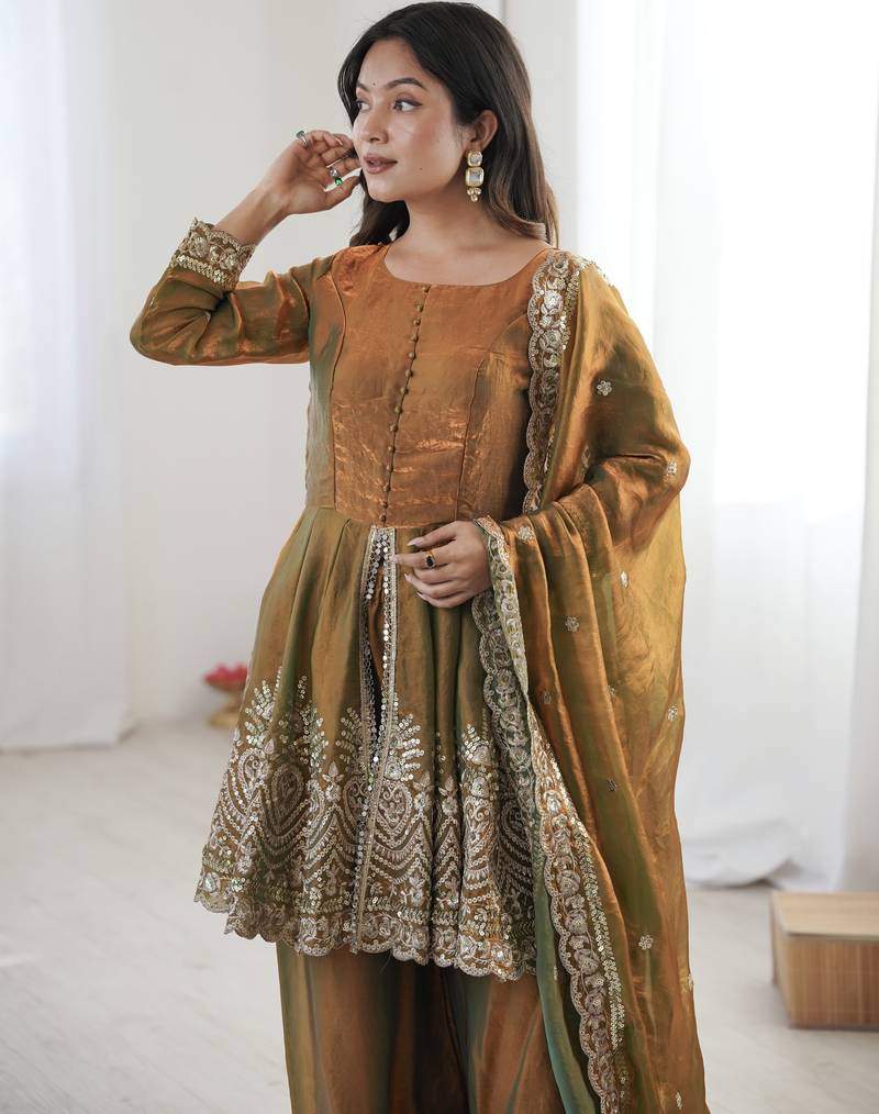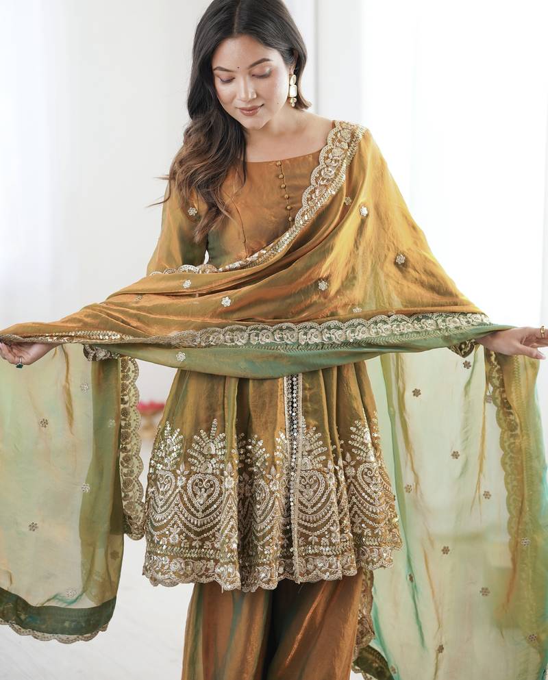 Olive color fendy satin silk embroidery work party wear salwar suit stitched