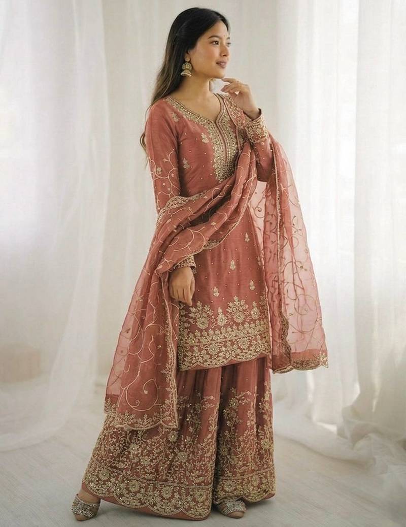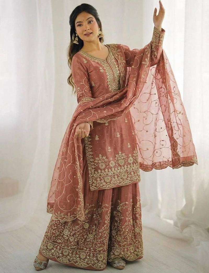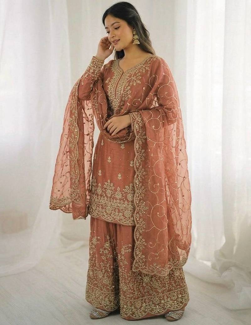 Peach color gymmi silk embroidery work wedding wear sharara set stitched