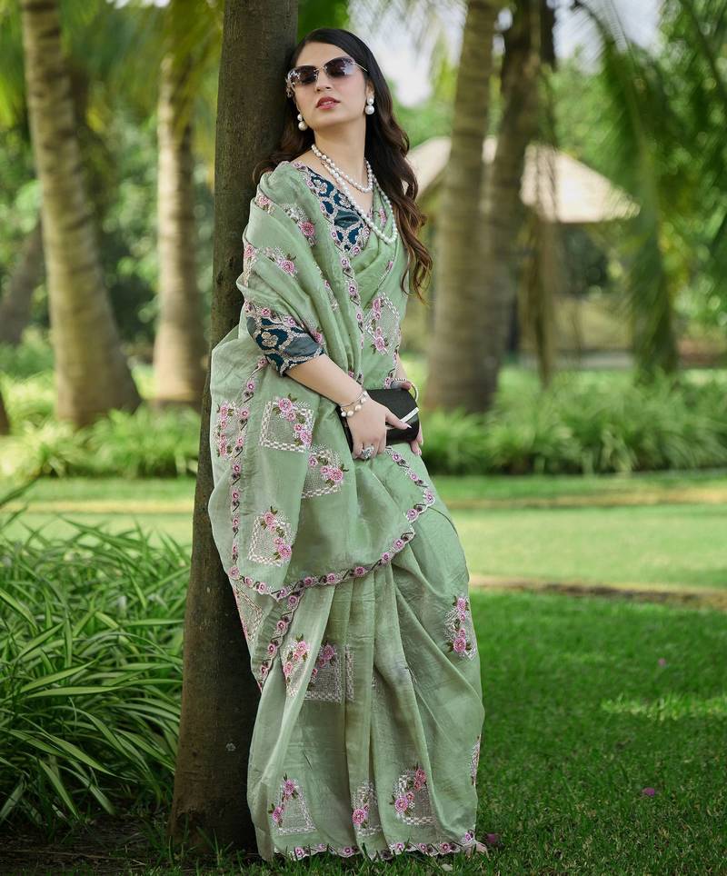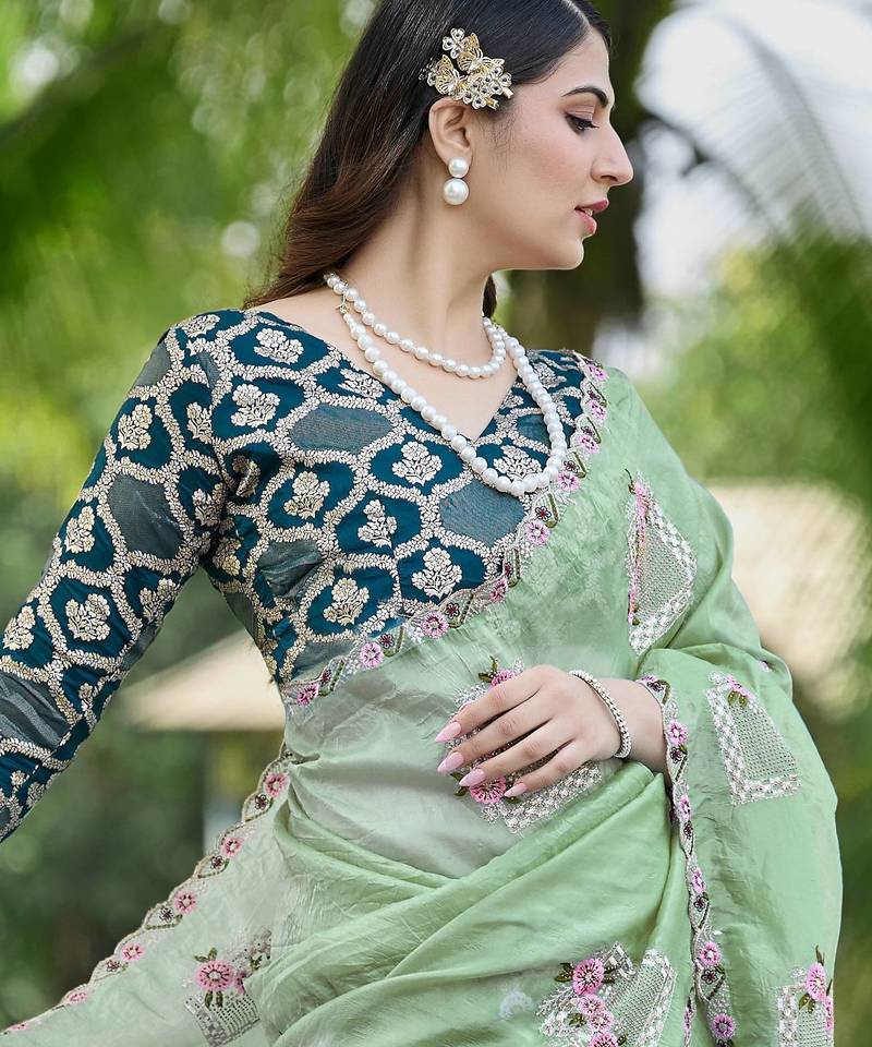 Pista color pure papel silk heavy embroidery work wedding wear saree