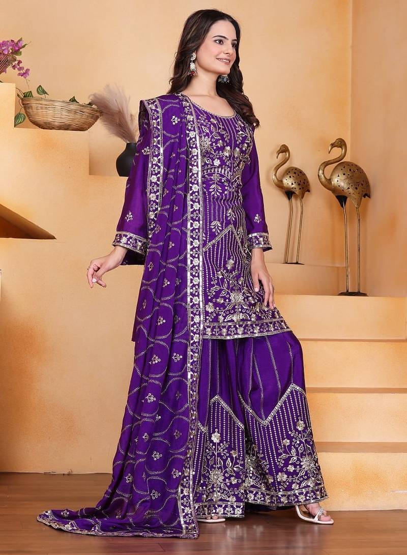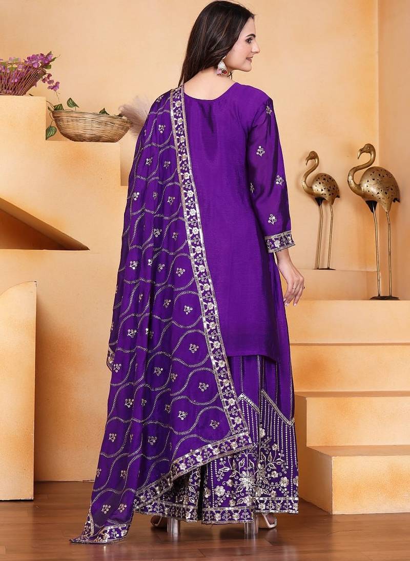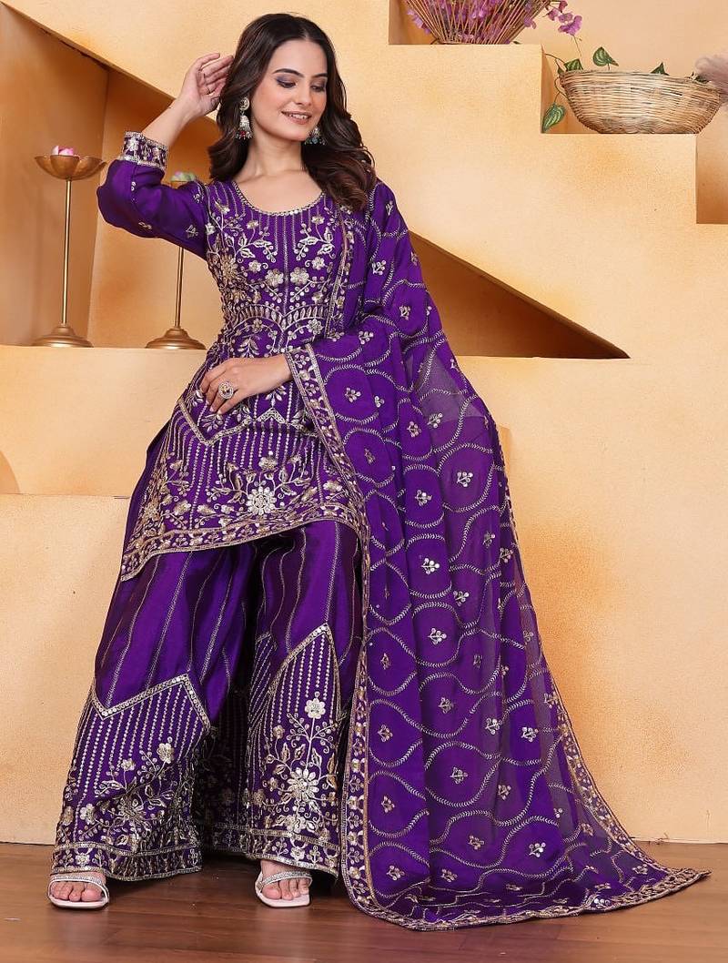 Purple color chinnon silk embroidery work wedding wear plazo set stitched