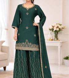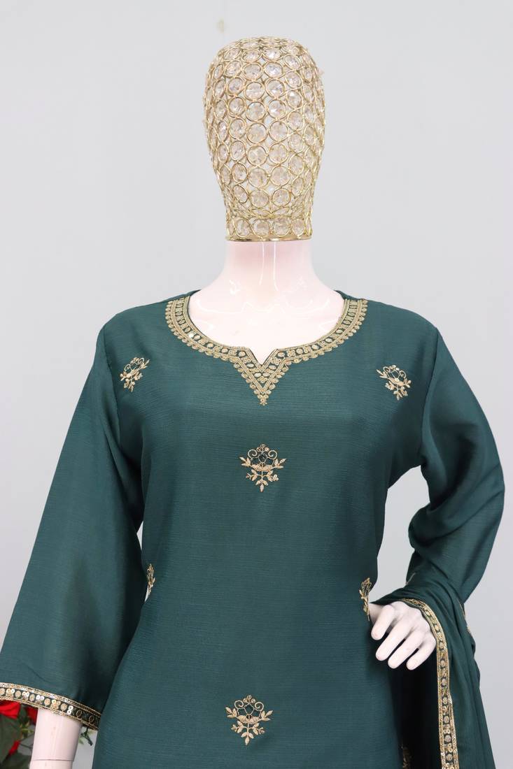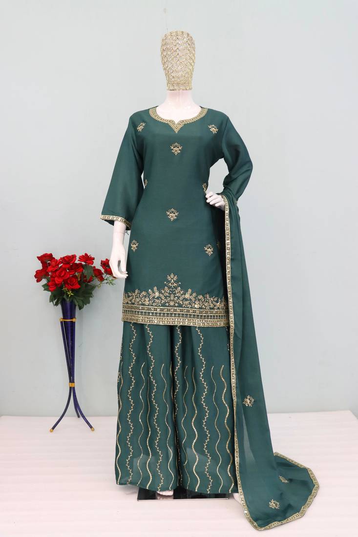 Teal color chinnon silk heavy embroidery work party wear plazo set stitched