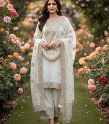 White color fendy silk embroidery work wedding wear salwar suit stitched