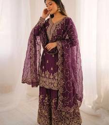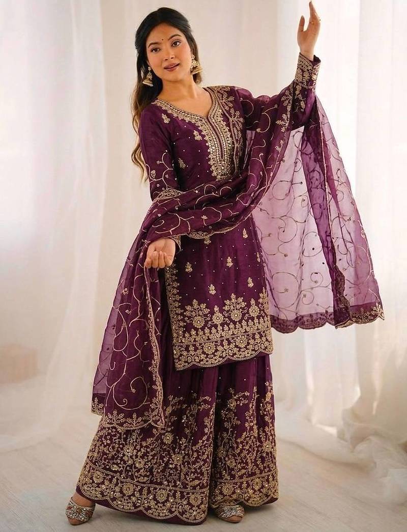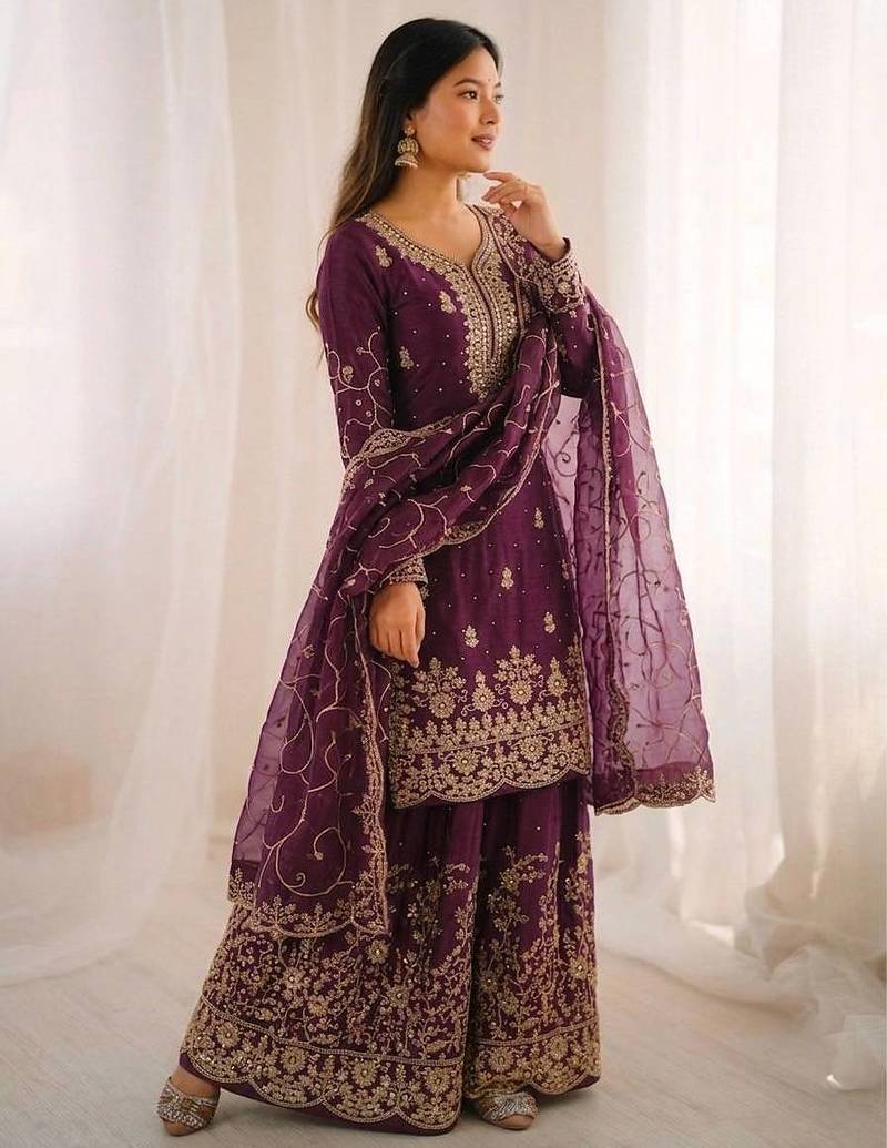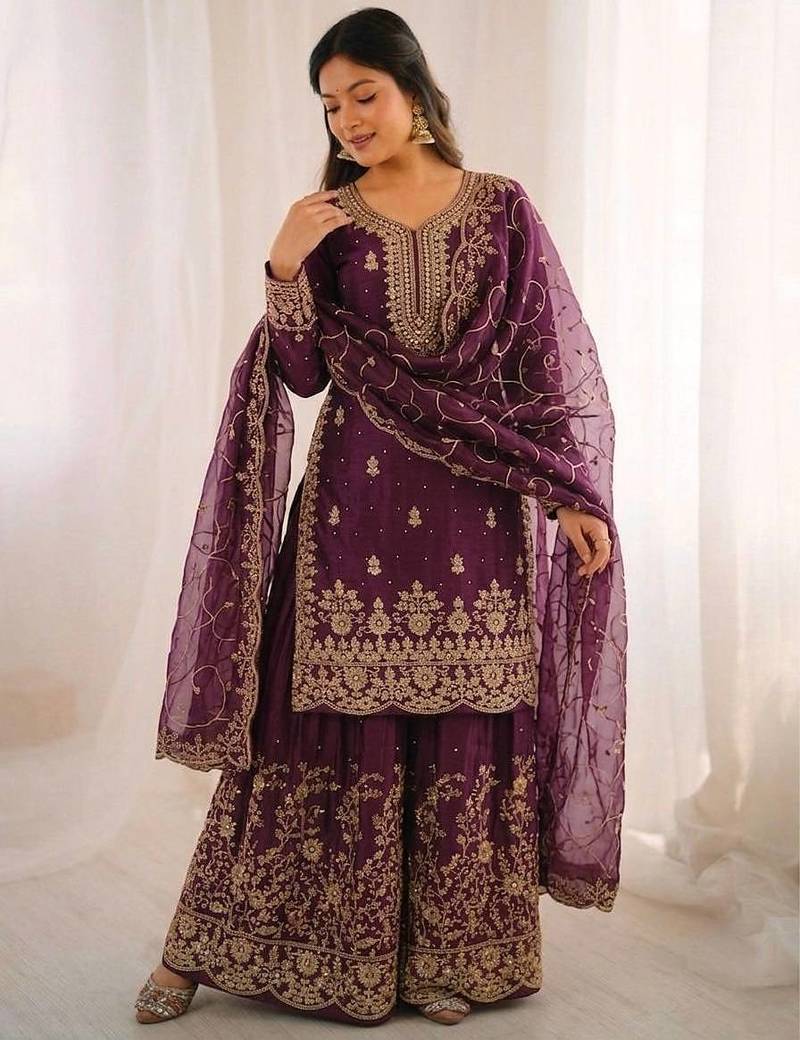 Wine color gymmi silk embroidery work wedding wear sharara set stitched