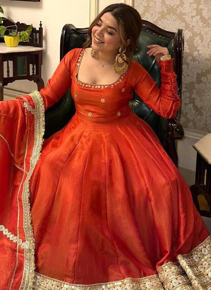 Womens new fancy silk heavy quality fabric with handwork gown set stitched