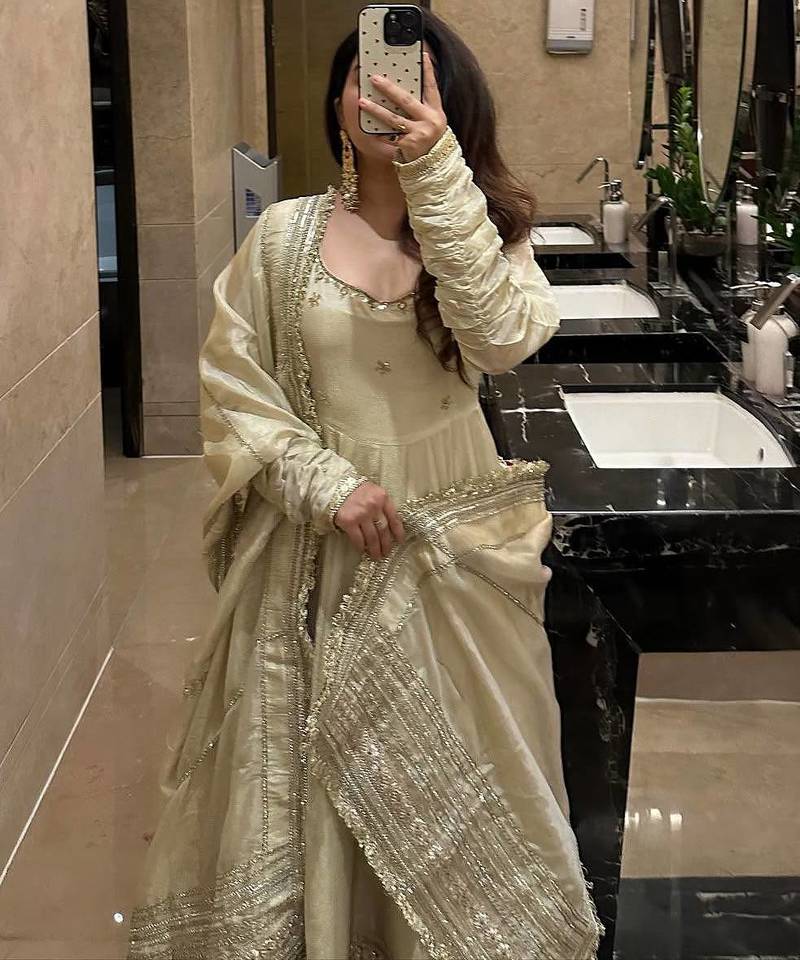 Womens new fancy silk heavy quality fabricwith handwork gown set stitched