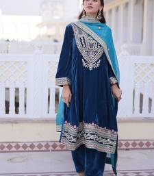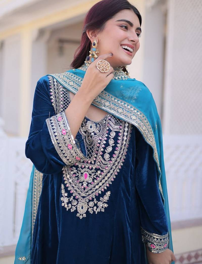 Womens new rama velvet with rich zari coding embroidered work kurta pant duppata set stitched