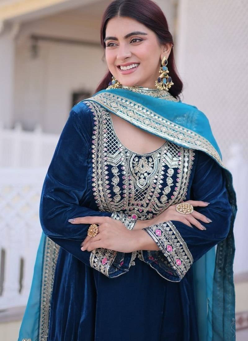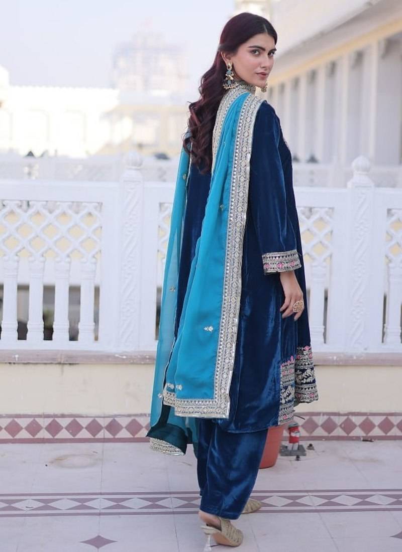 | Product Name | Womens New Rama Velvet With Rich Zari Coding Embroidered Work Kurta Pant Duppata Set | |