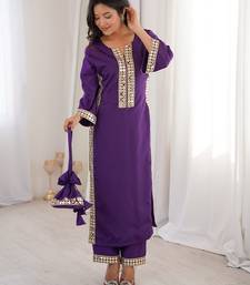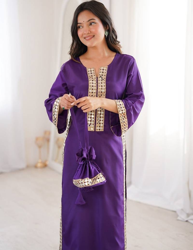 | Product Name | Womens New Trending Purple Color Natural Crepe With Real Mirror Lace Work Kurta Set | |