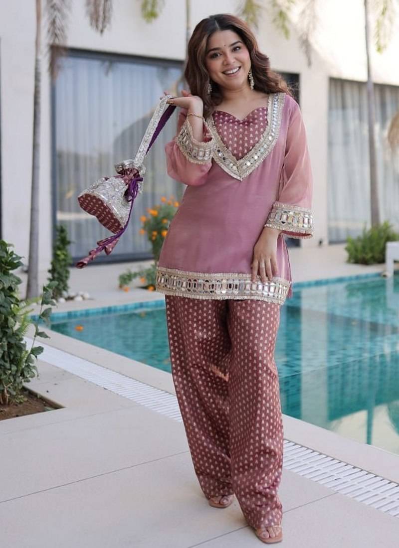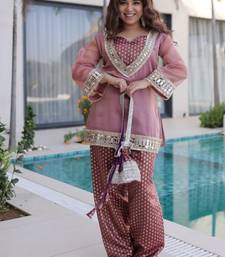 | Product Name | Womens New Wedding Wear Peach Color Salasa Fabrics With Mirror & Lace Work Kurta Pant Set | |