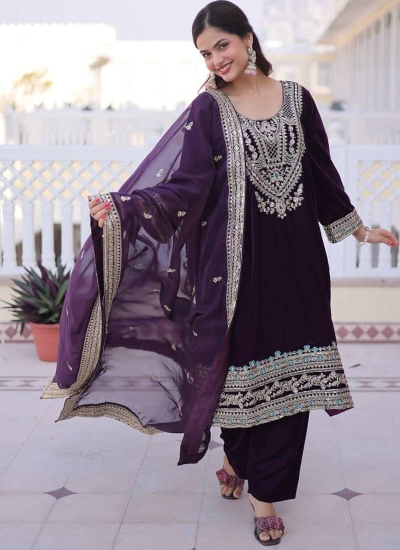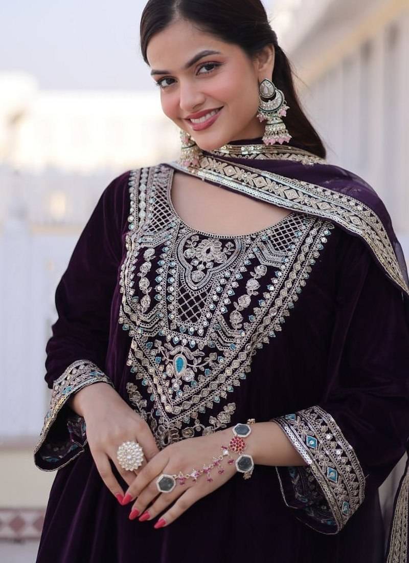 Womens new wine velvet with rich zari coding embroidered work kurta pant duppata set stitched