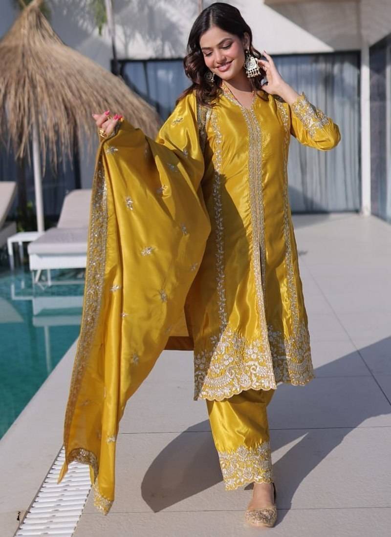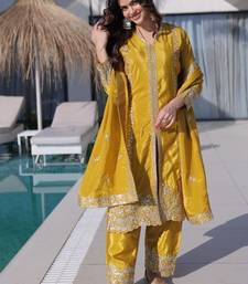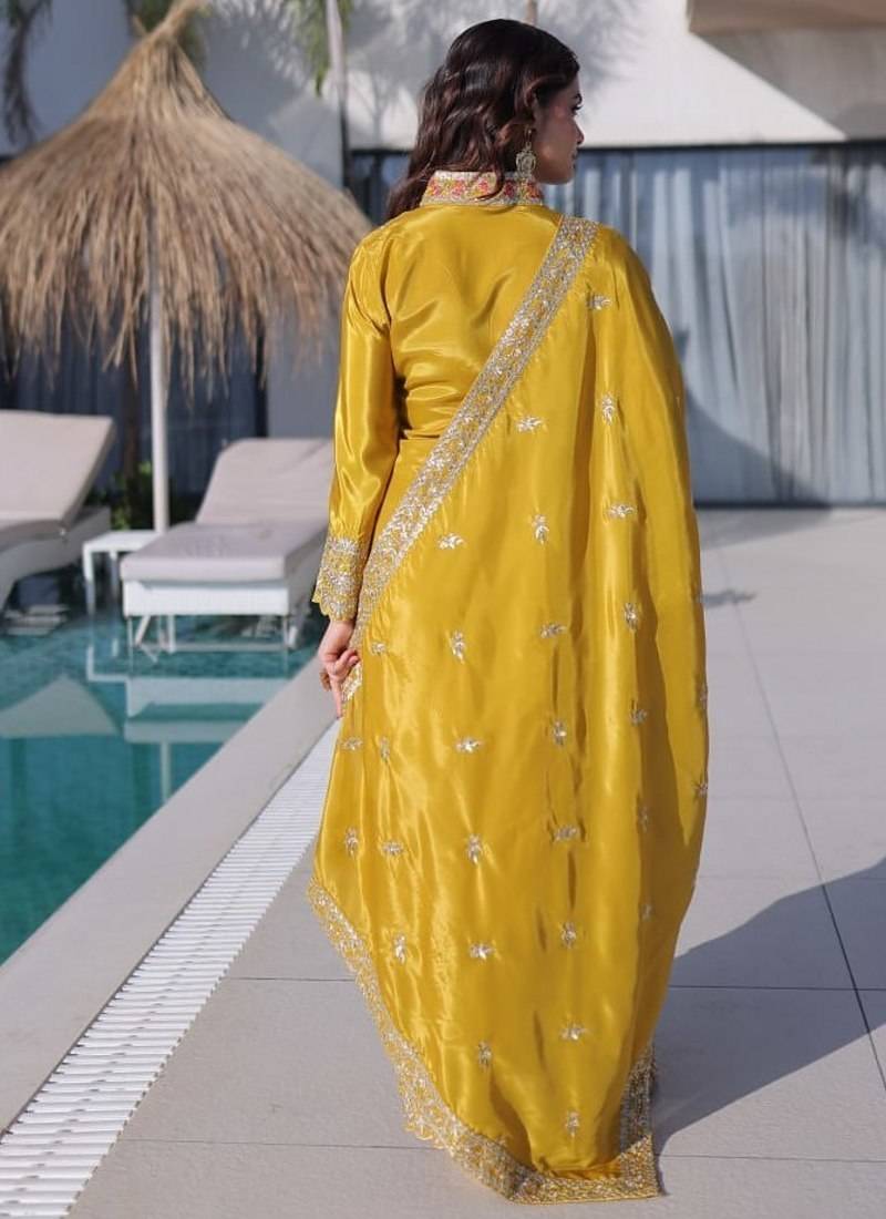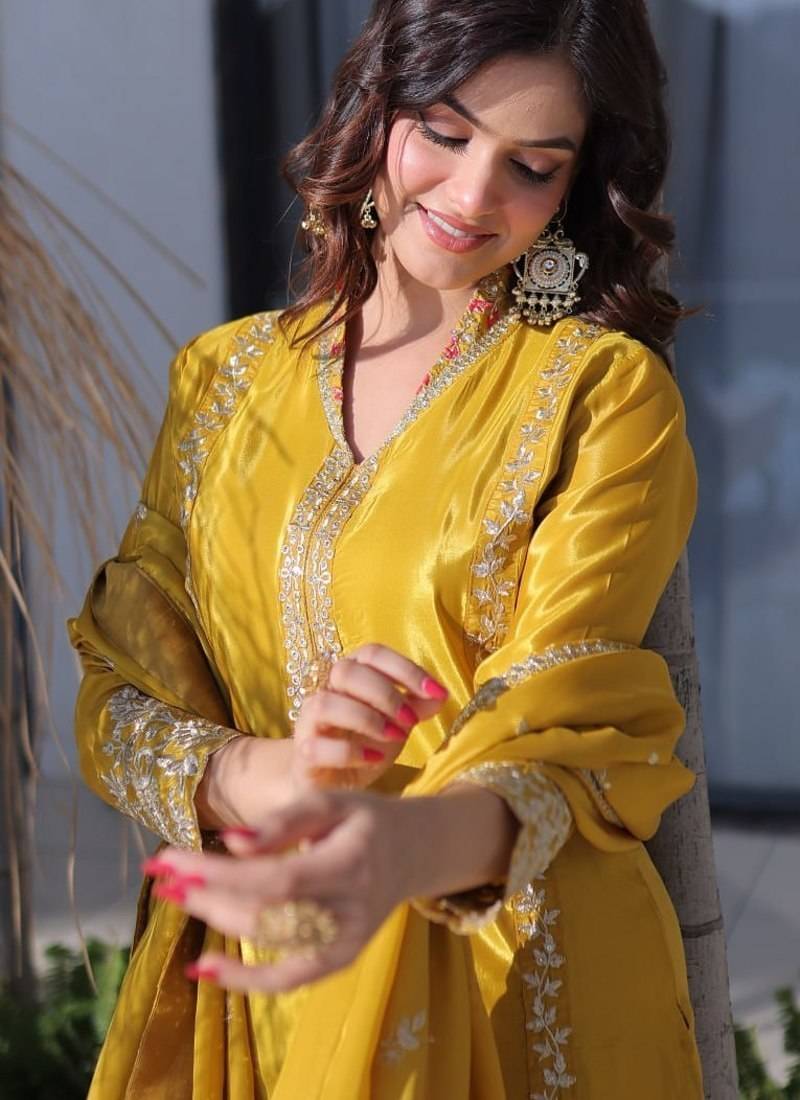 Womens new yellow silk with rich zari coding embroidered work kurta pant set stitched
