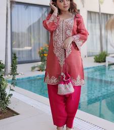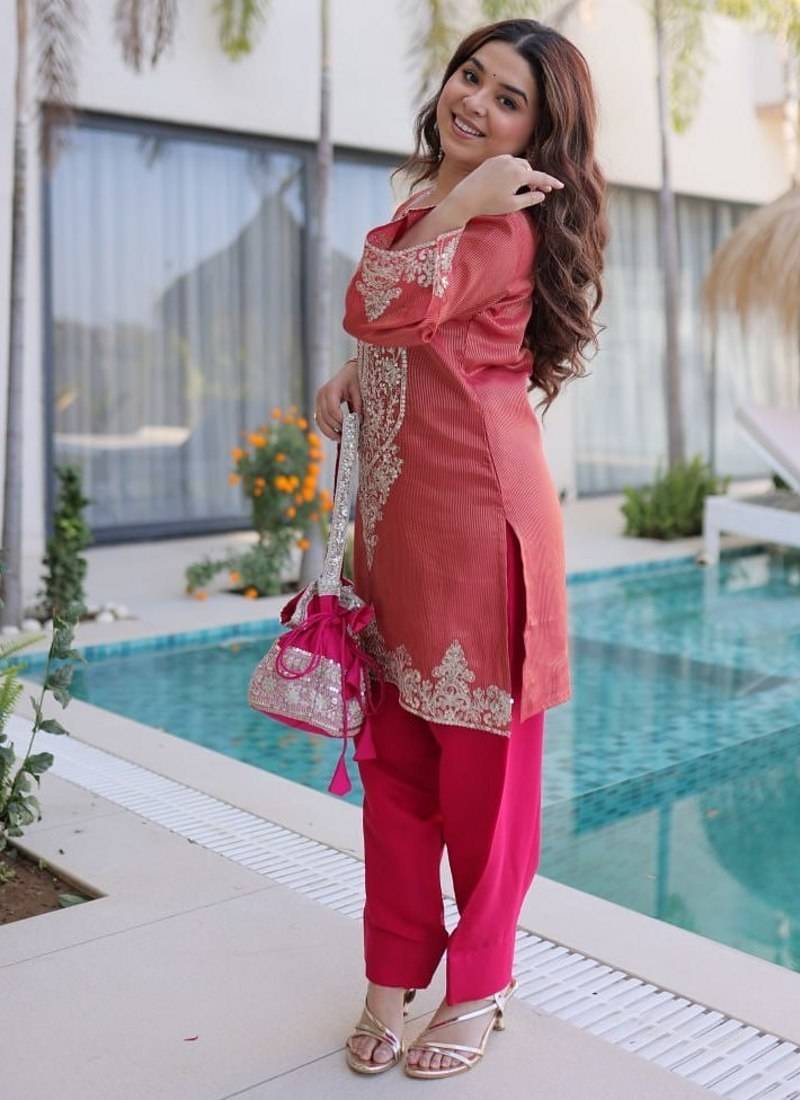 Womens wear peach,pink color viscose fabric with sequins & coding zari embroidered work kurta pant set stitched