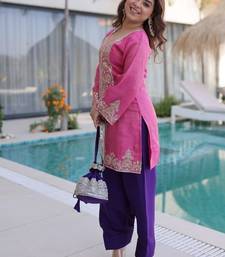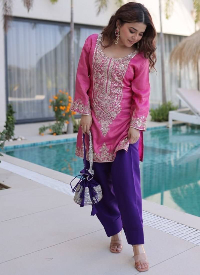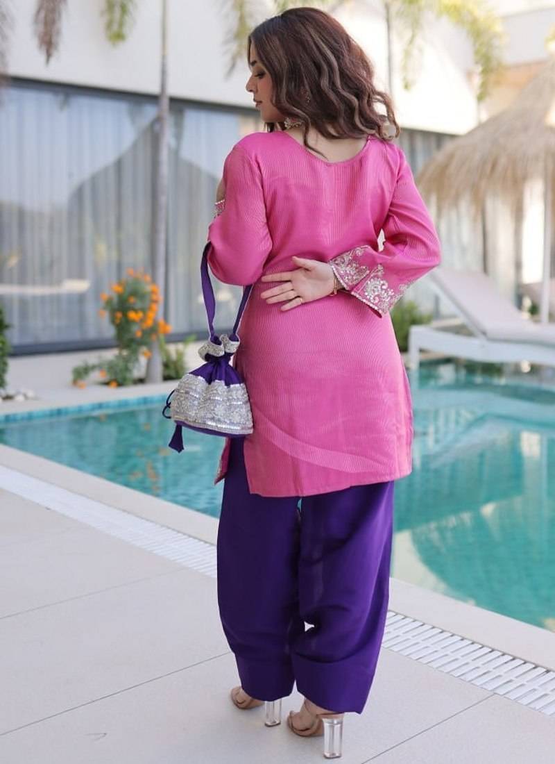 Womens wear purple,pink color viscose fabric with sequins & coding zari embroidered work kurta pant set stitched