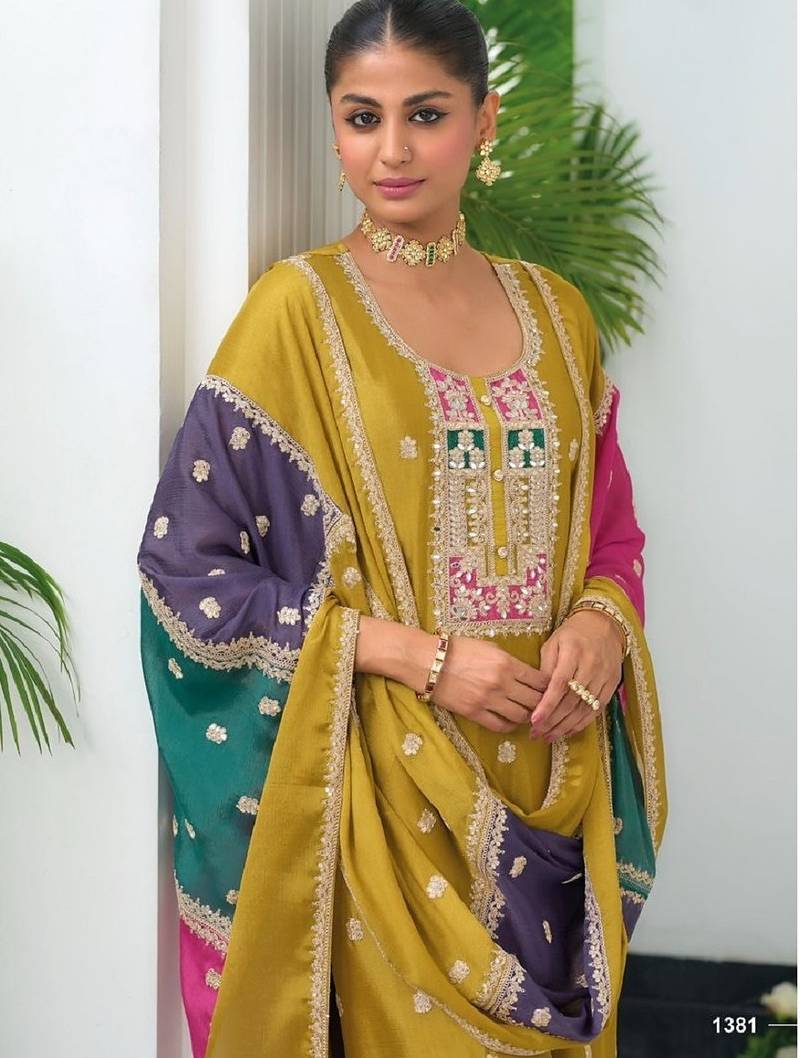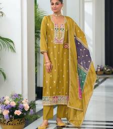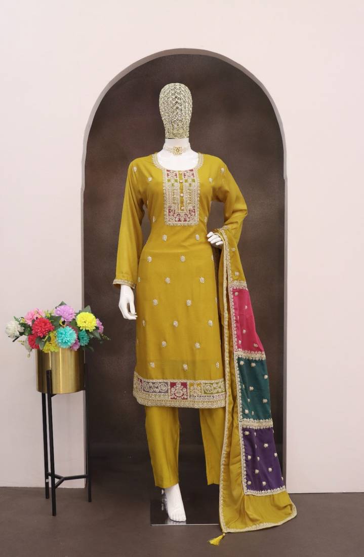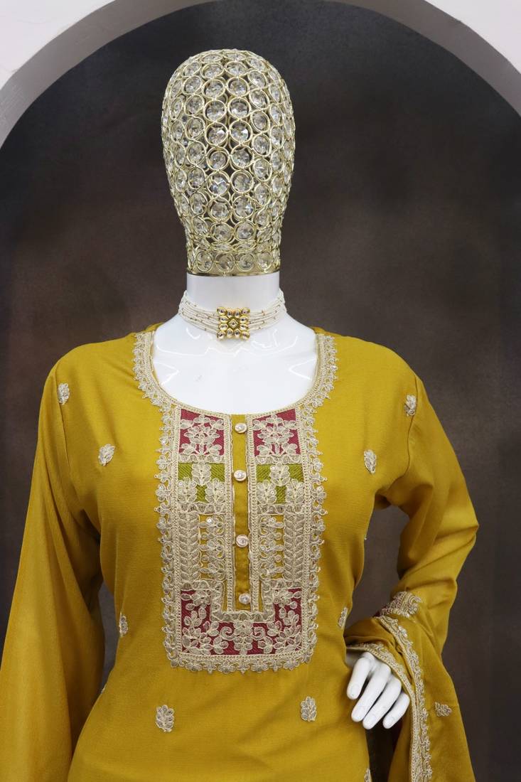 Yellow color chinnon silk embroidery work wedding wear designer salwar suit stitched