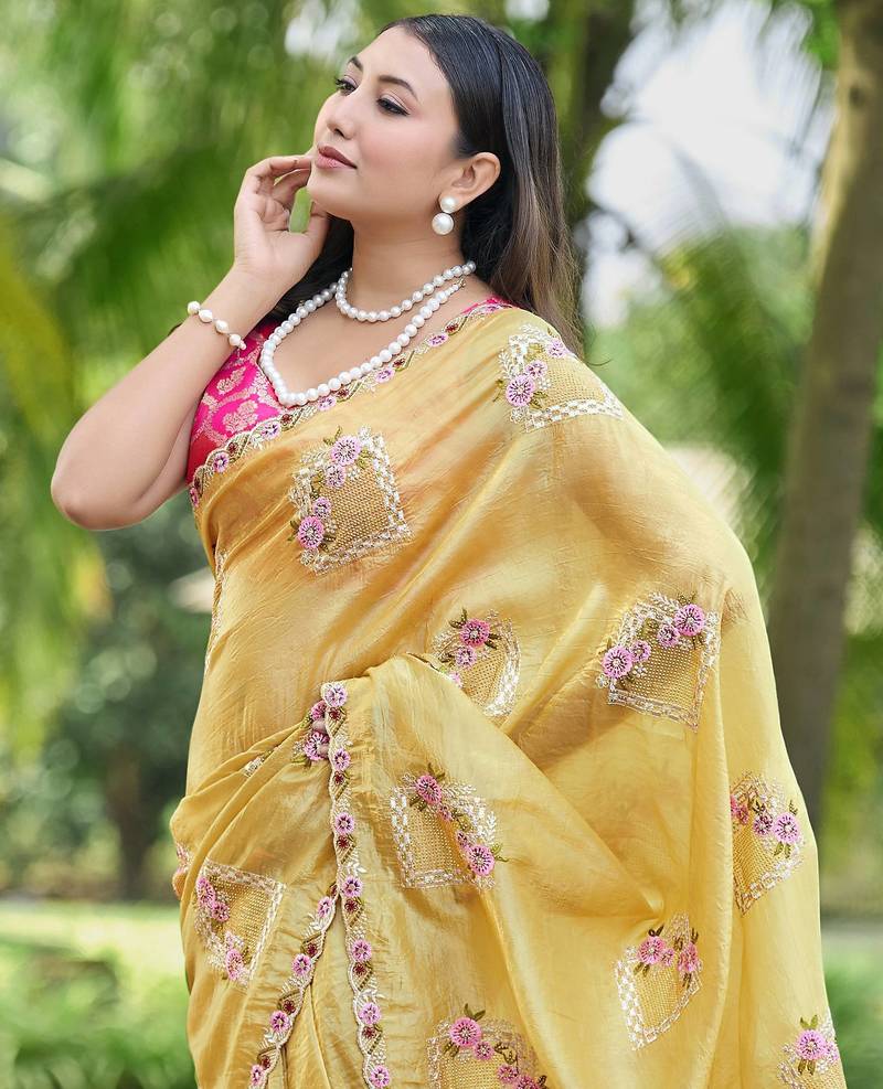Yellow color pure papel silk heavy embroidery work wedding wear saree