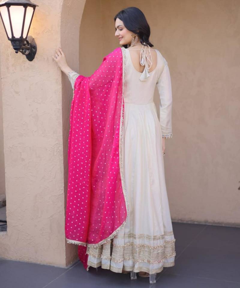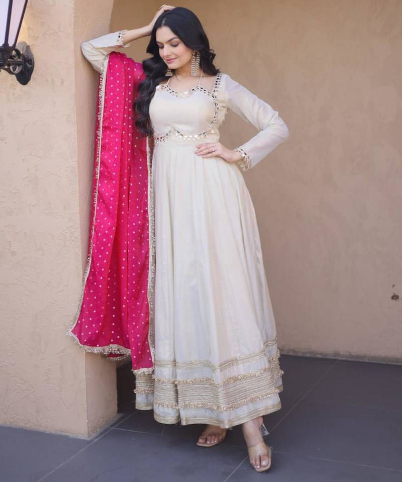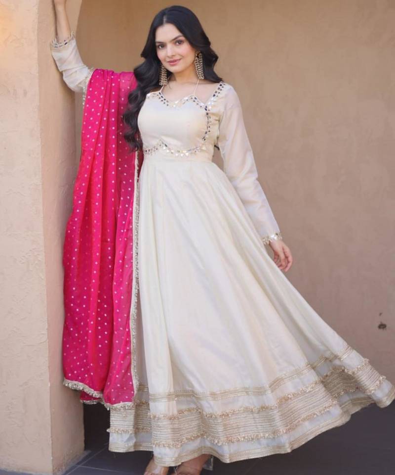 Off white cosmos real mirror with zari embroidered lace work flared gown with heavy dupatta stitched